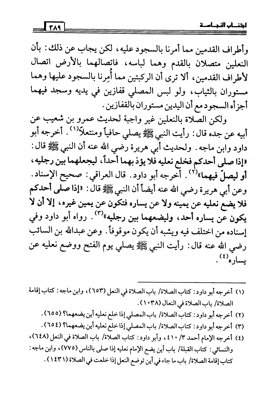 (¬4) أخرجه الإمام أحمد 3/410، وأبو داود: كتاب الصلاة / باب الصلاة في النعل (648) ، والنسائي: كتاب القبلة / باب أين يضع الإمام نعليه إذا صلى بالناس (775) ، وابن ماجه: كتاب إقامة الصلاة / باب ما جاء في أين توضع النعل إذا خلعت في الصلاة (1431) .