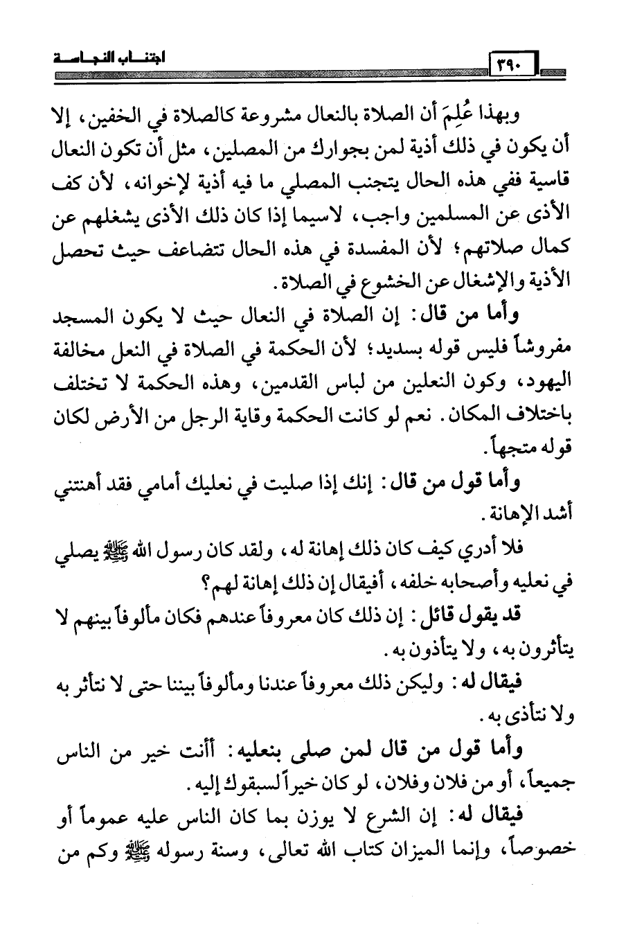 وأما من قال: إن الصلاة في النعال حيث لا يكون المسجد مفروشاً فليس قوله بسديد، لأن الحكمة في الصلاة في النعل مخالفة اليهود، وكون النعلين من لباس القدمين، وهذه الحكمة لا تختلف باختلاف المكان، نعم لو كانت الحكمة وقاية الرجل من الأرض لكان قوله متجهاً. وأما قول من قال: إنك إذا صليت في نعليك أمامي فقد أهنتني أشد الإهانة.