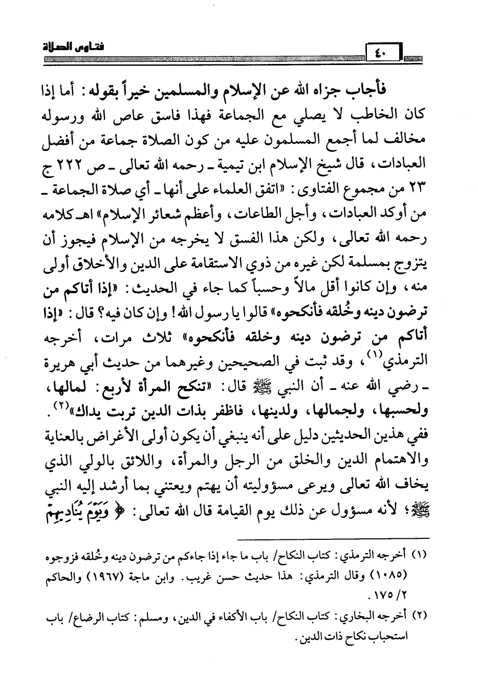 فأجاب جزاه الله عن الإسلام والمسلمين خيراً بقوله: أما إذا كان الخاطب لا يصلي مع الجماعة فهذا فاسق عاص الله ورسوله مخالف لما أجمع المسلمون عليه من كون الصلاة جماعة من أفضل العبادات، قال شيخ الإسلام ابن تيمية – رحمه الله تعالى – ص222 ج 23 من مجموع الفتاوى: " اتفق العلماء على أنها – أي صلاة الجماعة – من أوكد العبادات، وأجل الطاعات، وأعظم شعائر الإسلام " اهـ كلامه رحمه الله تعالى، ولكن هذا الفسق لا يخرجه من الإسلام فيجوز أن يتزوج بمسلمة لكن غيره من ذوي الاستقامة على الدين والأخلاق أولى منه، وإن كانوا أقل مالاً وحسباً كما جاء في الحديث: " إذا أتاكم من ترضون دينه وخلقه فأنكحوه " قالوا يا رسول الله وإن كان فيه؟ قال: " إذا أتاكم من ترضون دينه وخلقه فأنكحوه " ثلاث مرات، أخرجه الترمذي (¬1) ، وقد ثبت في الصحيحين وغيرهما من حديث أبي هريرة رضي الله عنه، أن النبي صَلَّى اللَّهُ عَلَيْهِ وَسَلَّمَ قال: " تنكح المرأة لأربع: لمالها، ولحسبها، ولجمالها، ولدينها، فاظفر بذات الدين تربت يداك " (¬2) . ففي هذين الحديثين دليل على أنه ينبغي أن يكون أولى الأغراض بالعناية والاهتمام الدين والخلق من الرجل والمرأة، واللائق بالولي الذي يخاف الله تعالى ويرعى مسؤوليته أن يهتم ويعتني بما أرشد إليه النبي صَلَّى اللَّهُ عَلَيْهِ وَسَلَّمَ، لأنه مسؤول عن ذلك يوم القيامة قال الله تعالى: (وَيَوْمَ يُنَادِيهِمْ