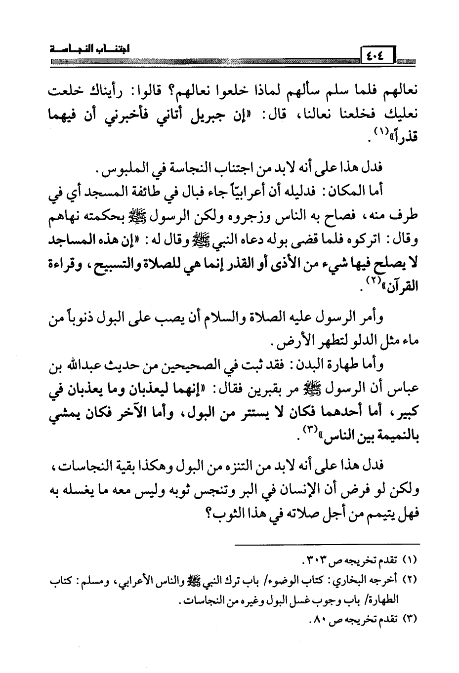 (¬2) أخرجه البخاري: كتاب الوضوء / باب ترك النبي صَلَّى اللَّهُ عَلَيْهِ وَسَلَّمَ والناس الأعرابي، ومسلم: كتاب الطهارة / باب وجوب غسل البول وغيره من النجاسات.