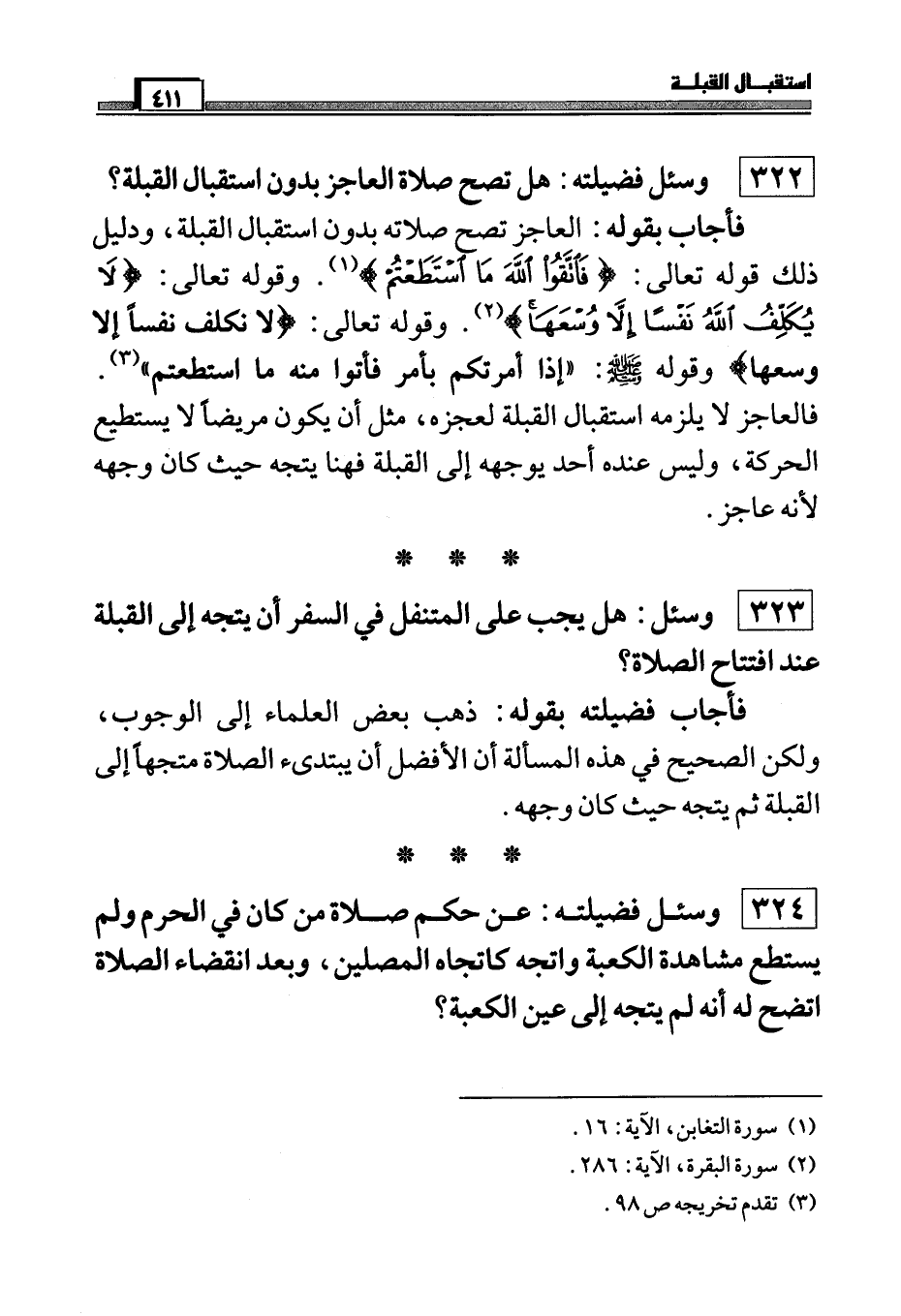 فأجاب بقوله: العاجز تصح صلاته بدون استقبال القبلة، ودليل ذلك قوله تعالى: (فَاتَّقُوا اللَّهَ مَا اسْتَطَعْتُمْ) (¬1) . وقوله تعالى: (لا يُكَلِّفُ اللَّهُ نَفْساً إِلَّا وُسْعَهَا) (¬2) . وقوله صَلَّى اللَّهُ عَلَيْهِ وَسَلَّمَ: (إذا أمرتكم بأمر فأتوا منه ما استطعتم)) (¬3) . فالعاجز لا يلزمه استقبال القبلة لعجزه، مثل أن يكون مريضاً لا يستطيع الحركة، وليس عنده أحد يوجهه إلى القبلة فهنا يتجه حيث كان وجهه لأنه عاجز.