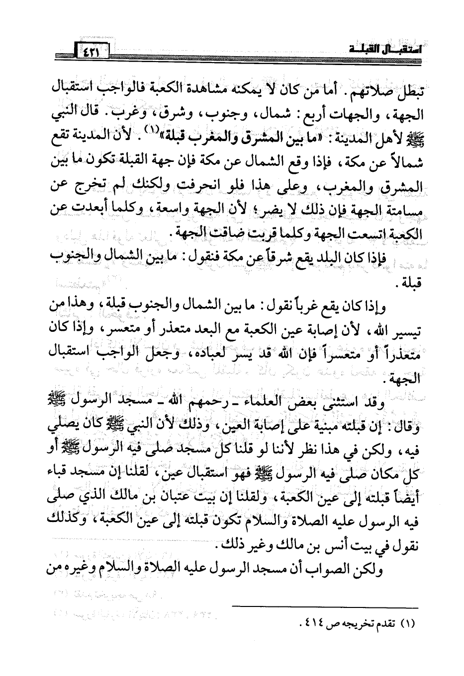 وقد استثنى بعض العلماء – رحمهم الله – مسجد الرسول صَلَّى اللَّهُ عَلَيْهِ وَسَلَّمَ وقال: إن قبلته مبنية على إصابة العين، وذلك لأن النبي صَلَّى اللَّهُ عَلَيْهِ وَسَلَّمَ كان يصلي قيه، ولكن في هذا نظر لأننا لو قلنا كل مسجد صلى فيه الرسول صَلَّى اللَّهُ عَلَيْهِ وَسَلَّمَ أو كان مكان صلى فيه الرسول صَلَّى اللَّهُ عَلَيْهِ وَسَلَّمَ فهو استقبال عين، لقلنا إن مسجد قباء أيضاً قبلته إلى عين الكعبة، ولقنا إن بيت عتبان بن مالك الذي صلى فيه الرسول عليه الصلاة والسلام تكون قبلته عين الكعبة، وكذلك نقول في بيت أنس بن مالك وغير ذلك.