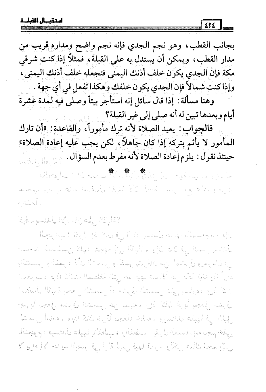 بجانب القطب، وهو نجم الجدي فإنه يجم واضح ومداره قريب من مدار القطب، ويمكن أن يستدل به على القبلة، فمثلاً إذا كنت شرقي مكة فإن الجدي يكون خلف أذنك اليمنى فتجعله خلف أذنك اليمنى، وإذا كنت شمالاً فإن الجدي يكون خلفك وهكذا تفعل في أي جهة.
