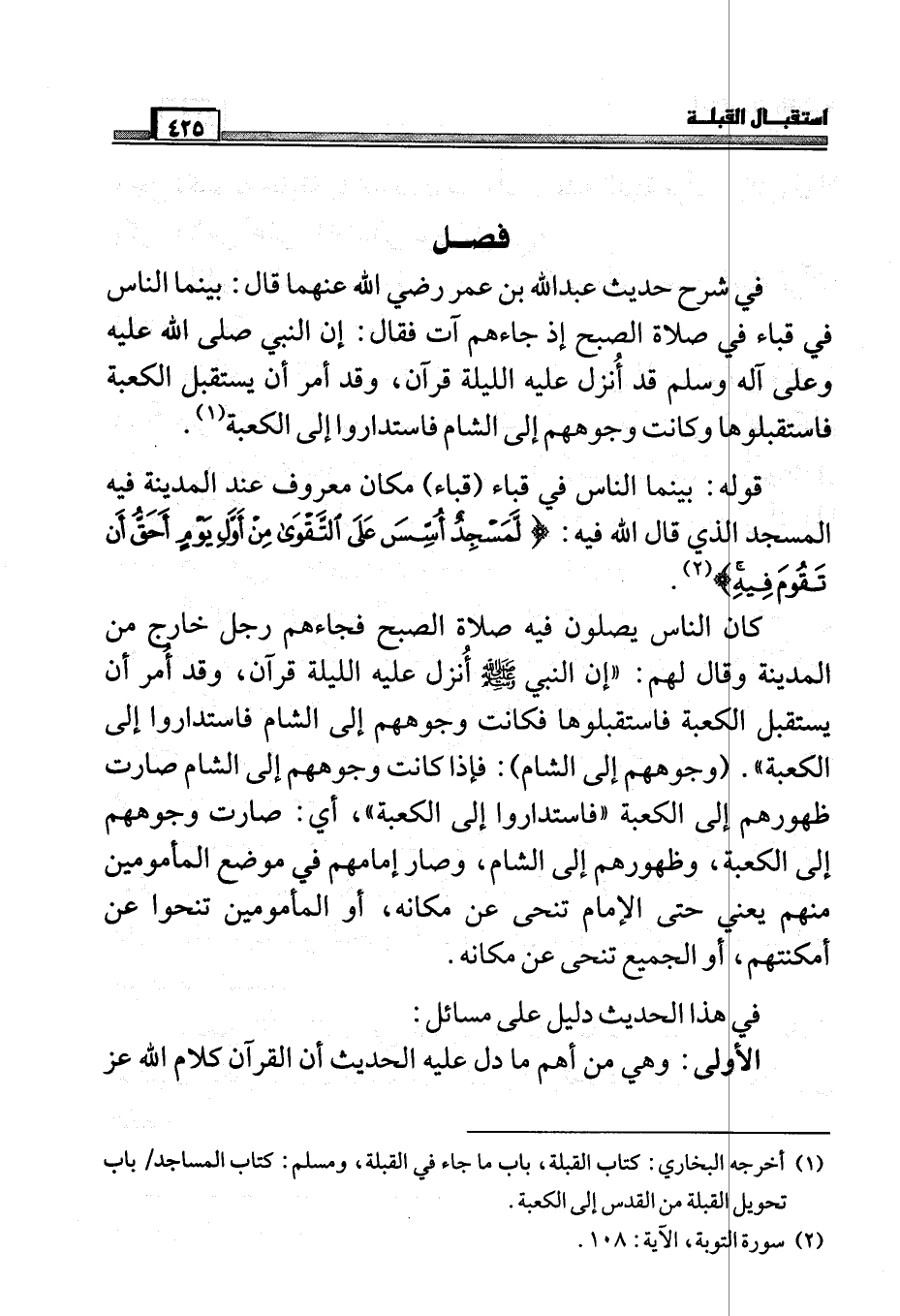 في شرح حديث عبد الله بن عمر رضى الله عنه قال: بينما الناس في قباء في صلاة الصبح إذ الصبح إذ جاءهم آت فقال: إن النبي صلى الله عليه وعلى آله وسلم قد أنزل عليه الليلة قرآن، وقد أمر أن يستقبل الكعبة فاستقبلوها وكانت وجوههم إلى الشام فاستداروا إلى الكعبة (¬1) .