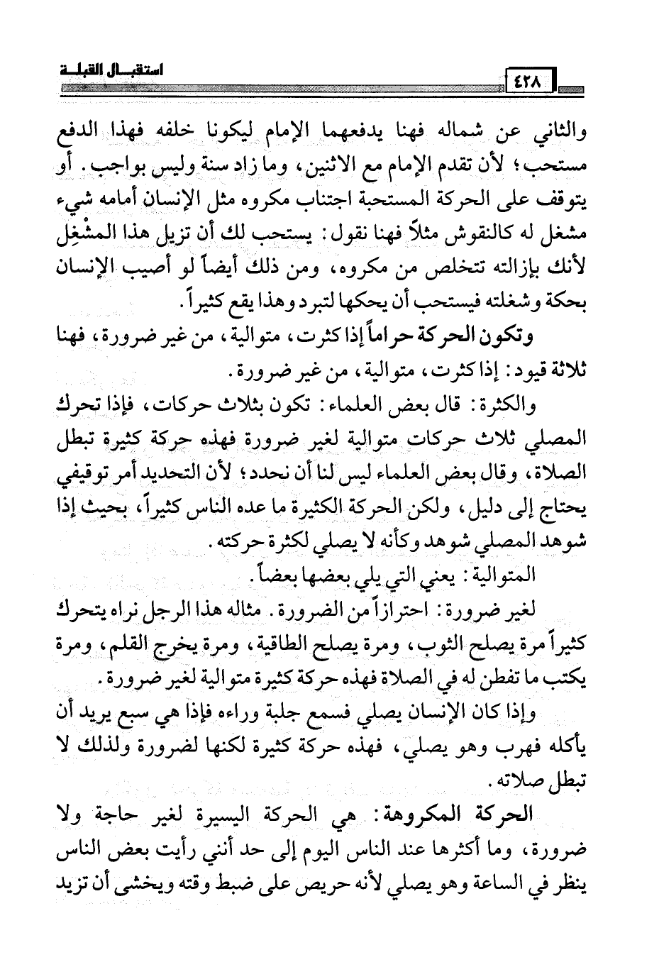 والثاني عن شماله فهنا يدفعهما الإمام ليكونا خلفه فهذا الدفع مستحب، لأن تقدم الإمام مع الاثنين، وما زاد سنة وليس بواجب، أن يتوقف على الحركة المستحبة اجتناب مكروه مثل الإنسان أمامه شيء مشغل له كالنقوش مثلاً فهنا نقول: يستحب لك أن تزيل هذا المشغل لأنك بإزالته تتخلص من مكروه، ومن ذلك أيضاً لو أصيب الإنسان بحكة وشغلته فيستحب أن يحكها لترد وهذا يقع كثيراً.