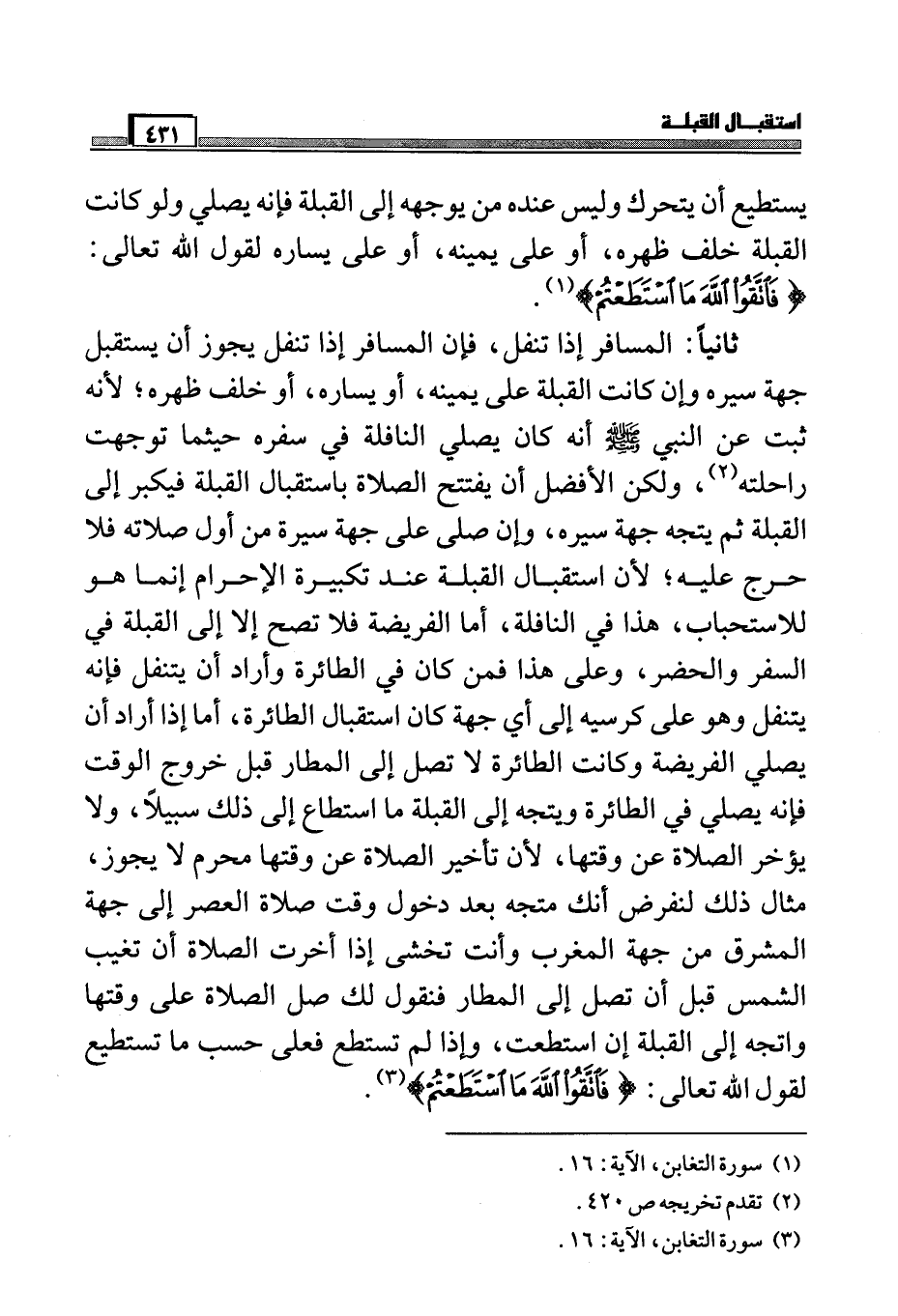 ثانياً: المسافر إذا تنفل، فإن المسافر إذا تنفل يجوز أن يستقبل جهة سيره، وإن كانت القبلة على يمينه، أو يساره، أو خلف ظهره، لأنه ثبت عن النبي صَلَّى اللَّهُ عَلَيْهِ وَسَلَّمَ أنه كان يصلي النافلة في سفره حيثما توجهت راحلته (¬2) ، ولكن الأفضل أن يفتتح الصلاة باستقبال القبلة فيكبر إلى القبلة ثم يتجه جهة سيره، وإن صلى على جهة سيرة من أول صلاته فر حرج عليه، لأن استقبال القبلة عند تكبيرة الإحرام إنما للاستحباب، هذا في النافلة، أما في الفريضة فلا تصح إلا إلى القبلة في السفر والحضر، وعلى هذا فمن كان في الطائرة وأراد أن يتنفل فإنه يتنقل وهو على كرسيه إلى أي جهة كان استقبال الطائرة، أما إذا أراد أن يصلي الفريضة وكانت الطائرة لا تصل إلى المطار قبل خروج الوقت فإنه يصلي في الطائرة ويتجه إلى القبلة ما استطاع إلى ذلك سبيلاً، ولا يؤخر الصلاة عن وقتها، لأن تأخير الصلاة عن وقتها محرم ولا يجوز، مثال ذلك لنفرض أنك متجه بعد دخول وقت صلاة العصر إلى جهة المشرق من جهة المغرب وأنت تخشى إذا أخرجت الصلاة أن تغيب الشمس قبل أن تصل إلى المطار فنقول لك صلى الصلاة على وقتها واتجه إلى القبلة إن استطعت، وإذا لم تستطع فعلى حسب ما تستطيع لقول الله تعالى (فَاتَّقُوا اللَّهَ مَا اسْتَطَعْتُم) (¬3) .