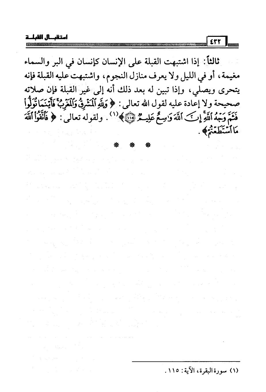 ثالثاً: إذا اشتبهت القبلة على الإنسان كإنسان في البر والسماء مغيمة، أو في الليل ولا يعرف منازل النجوم، واشتبهت عليه القبلة فإنه يتحرى ويصلي، وإذا تبين له بعد ذلك أنه إلى غير القبلة فإن صلاته صحيحة ولا إعادة عليه لقول الله تعالى: (وَلِلَّهِ الْمَشْرِقُ وَالْمَغْرِبُ فَأَيْنَمَا تُوَلُّوا فَثَمَّ وَجْهُ اللَّهِ إِنَّ اللَّهَ وَاسِعٌ عَلِيمٌ) (¬1) . ولقوله تعالى: (فَاتَّقُوا اللَّهَ مَا اسْتَطَعْتُم) .