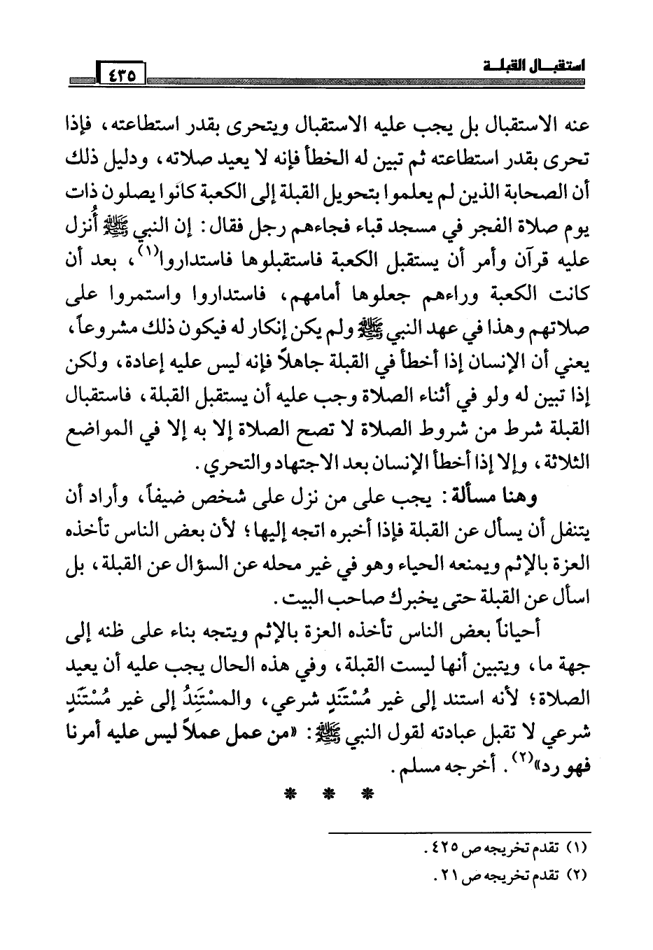 أحياناً بعض الناس تأخذه العزة بالإثم ويتجه بناء على ظنه إلى جهة ما، ويتبين أنها ليست القبلة، وفي هذه الحال يجب عليه أن يعيد الصلاة، لأنه استند إلى غير مستند شرعي، والمستند إلى غير مستند شرعي لا تقبل عبادته لقول النبي صَلَّى اللَّهُ عَلَيْهِ وَسَلَّمَ: ((من عمل عملاً ليس عليه أمرنا فهو رد)) (¬2) . أخرجه مسلم.