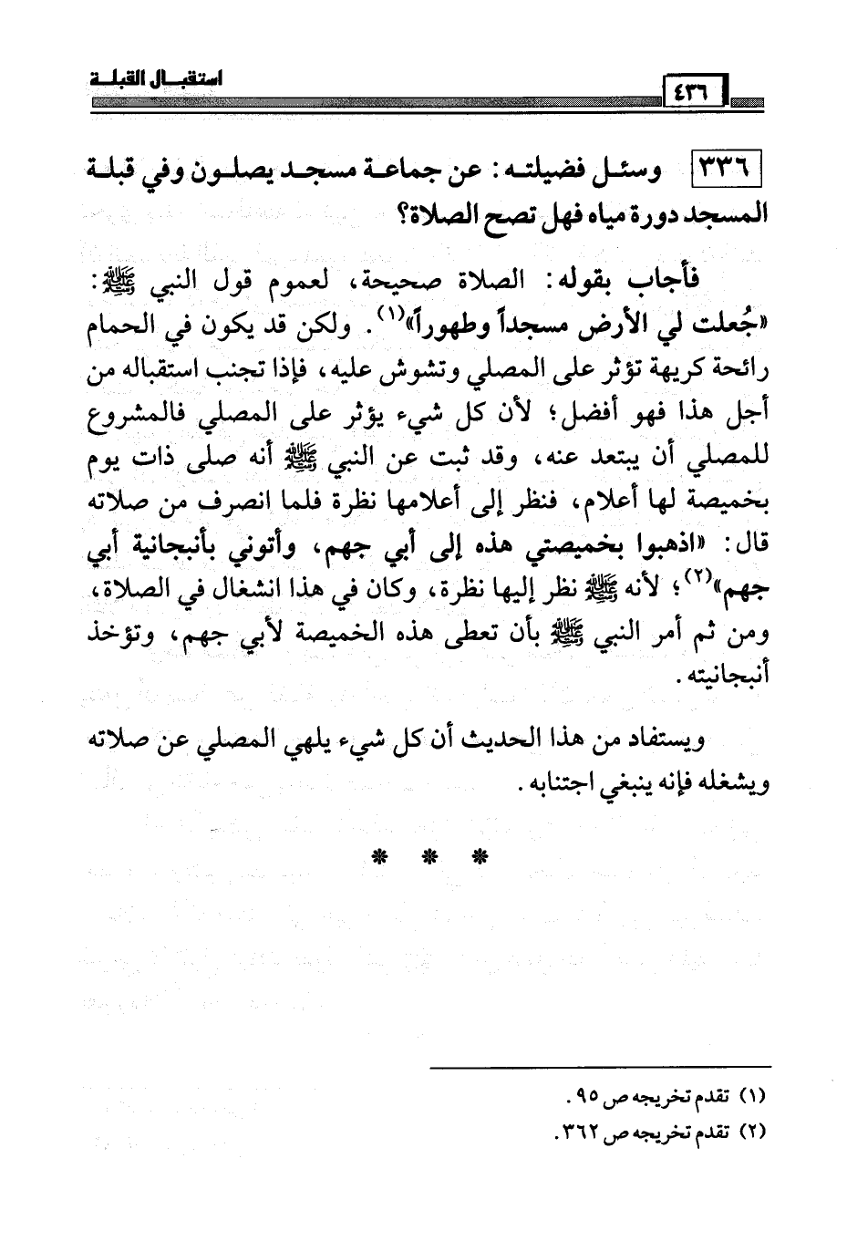 فأجاب بقوله: الصلاة صحيحة، لعموم قول النبي صَلَّى اللَّهُ عَلَيْهِ وَسَلَّمَ ((جعلت لي الأرض مسجداً وطهوراً)) (¬1) . ولكن قد يكون في الحمام رائحة كريهة تؤثر على المصلي وتشوش عليه، فإذا تجنب استقباله من أجل هذا فهو أفضل،لأن كل شيء يؤثر على المصلي فالمشروع للمصلي أن يبتعد عنه، وقد ثبت عن النبي صَلَّى اللَّهُ عَلَيْهِ وَسَلَّمَ أنه صلى ذات يوم بخميصة لها أعلام، فنظر إلى أعلامها نظرة فلما انصرف من صلاته قال: ((اذهبوا بخميصتي هذه إلى أبي جهم، وأتوني بإنبجانية أبي جهم)) (¬2) ، لأنه صَلَّى اللَّهُ عَلَيْهِ وَسَلَّمَ نظر إليها نظرة، وكان في هذا انشغال في الصلاة، ومن ثم أم النبي صَلَّى اللَّهُ عَلَيْهِ وَسَلَّمَ بأن تعطى هذه الخميصة لأبي جهم، وتؤخذ أنبجانيته.