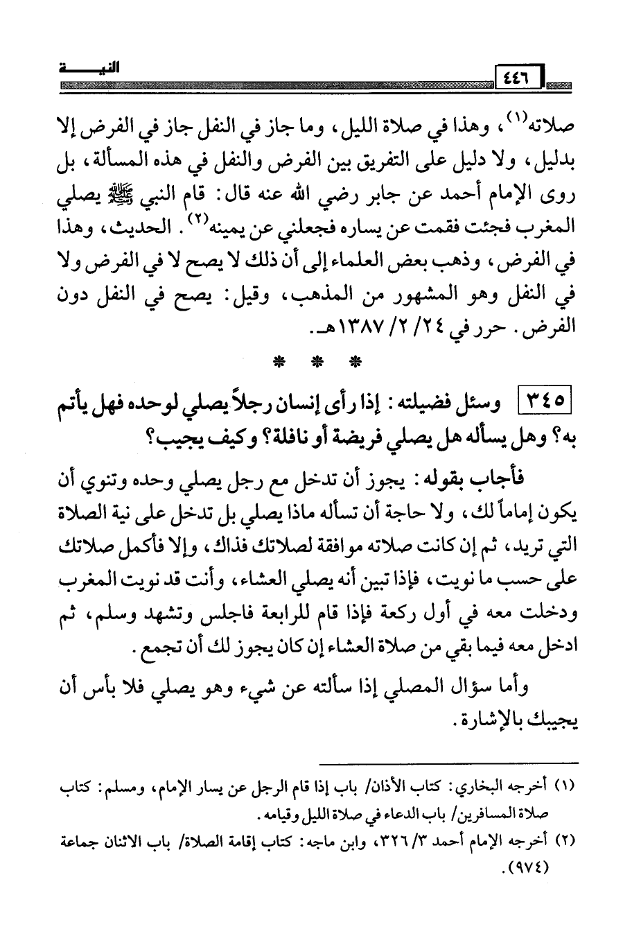344 سئل فضيلة الشيخ: عن الرجل يصلي وحده فيدخل معه آخر ويكون إماماً له فهل تصح صلاتهما؟
