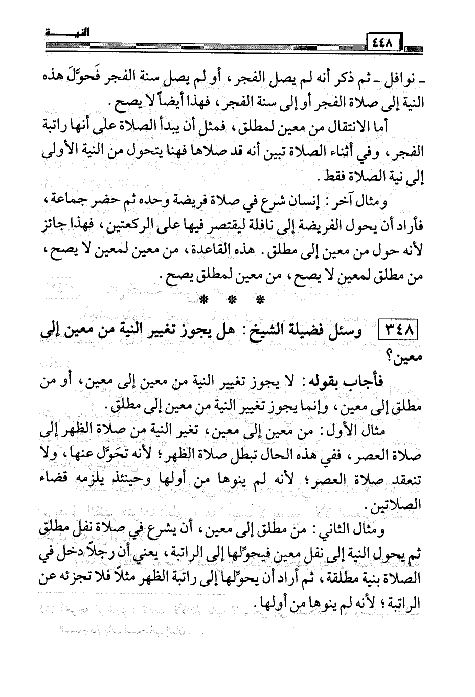 فأجاب بقوله: تغيير النية إما أن يكون من معين لمعين، أو من مطلق لمعين، فهذا لا يصح، وإذا كان من معين لمطلق فلا بأس، مثال ذلك.