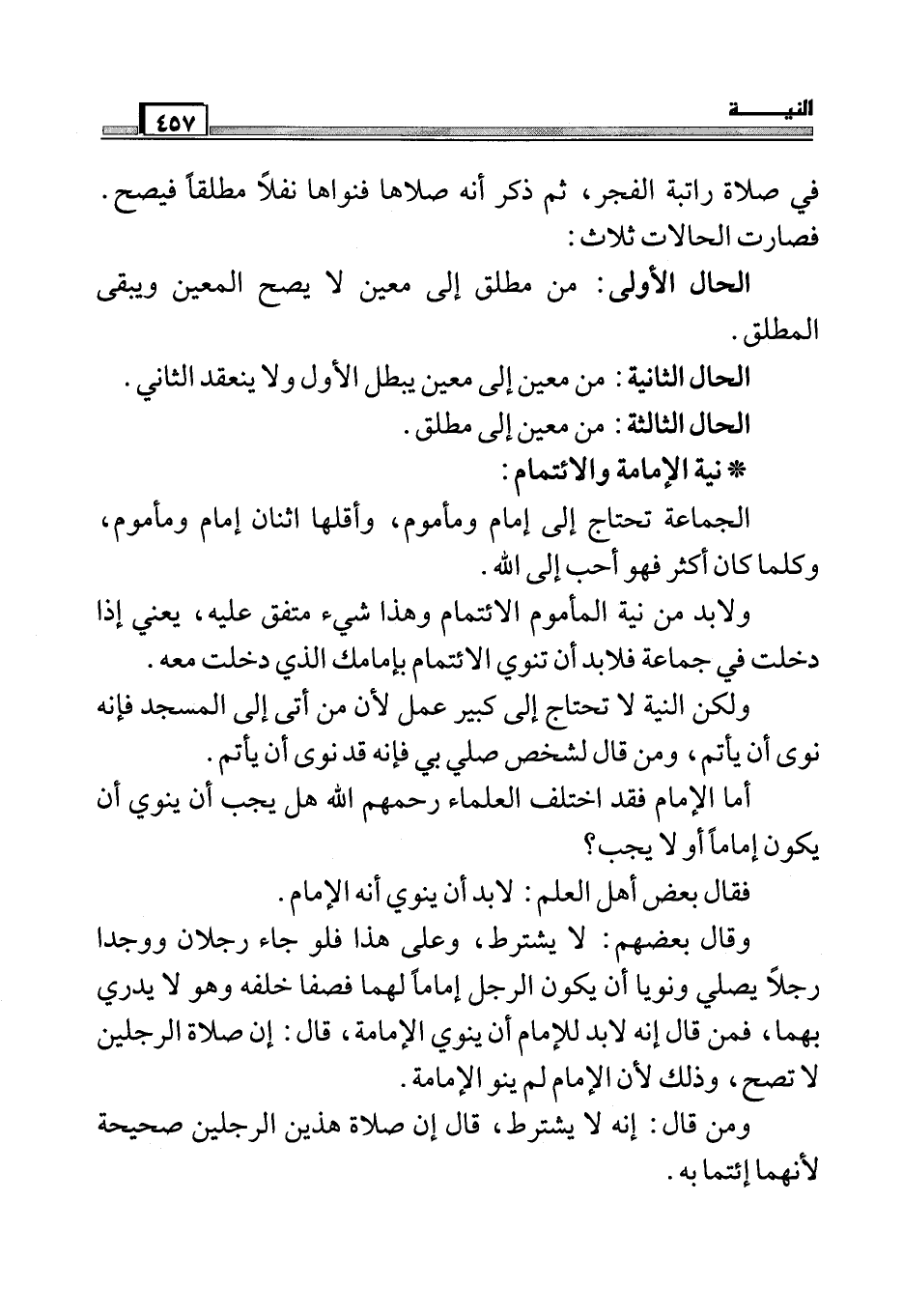 ومن النوافل المعينة الوتر، وركعتي الضحى، والرواتب فهذه لابد أن تعينها بالاسم، لكن بالقلب لا باللسان، فإذا أردت أن تصلي مثلاً وكبرت، ولكن ما نويت الوتر، وفي أثناء الصلاة نويتها الوتر فهاذ لا يصح، لأن الوتر نفل معين، والنوافل المعينة لابد أن تعين بعينها.