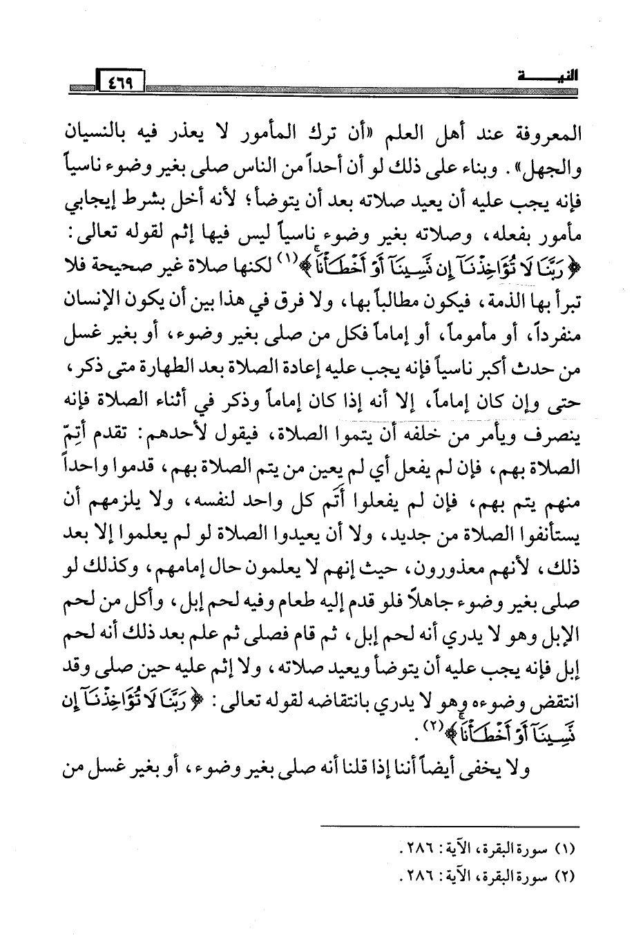 ومن المهم هنا أن نبين أن الطهارة من الحدث شرط، وهو من باب الأوامر التي يطلب فعلها، لا التي يطلب اجتنابها والقاعدة المعروفة عند أهل العلم ((أن ترك المأمور لا يعذر فيه بالنسيان والجهل)) . وبناء على ذلك لو أن أحداً من الناس صلى بغير وضوء ناسياً فإنه يجب عليه أن يعيد صلاته بعد أن يتوضاً، لأنه أخل بشرط إيجابي مأمور بفعله، وصلاته بغير وضوء ناسياً ليس فهيا إثم لقوله تعالى: (رَبَّنَا لا تُؤَاخِذْنَا إِنْ نَسِينَا أَوْ أَخْطَأْنَا) (¬1) لكنها صلاة غير صحيحة فلا تبرأ بها الذمة، فيكون مطالباً بها، ولا فرق في هذا بين أن يكون الإنسان منفرداً، أو مأموماً، أو إماماً فكل من صلى بغير وضوء، أو بغير غسل من حدث أكبر ناسياً فإنه يجب عليه إعادة الصلاة بعد الطهارة متى ذكر، حتى وإن كان إماماً، إلا أنه إذا كان إماماً وذكر في أثناء الصلاة فإنه ينصرف ويأمر من خلفه أن يتموا الصلاة، فيقول لأحدهم: تقدم أتم الصلاة بهم، فإن لم يفعل أي لم يعين من يتم الصلاة بهم، قدموا واحداً منهم يتم بهم، فإن لم يفعلوا أتم كل واحد لنفسه، ولا يلزمهم أن يستأنفوا الصلاة من جديد، ولا أن يعيدوا الصلاة لو لم يعلموا إلا بعد ذلك، لأنهم معذورون، حيث إنهم لا يعلمون حال إمامهم، وكذلك لو صلى بغير وضوء جاهلاً فلو قدم إليه طعام فيه لحم إبل، وأكل من لحم الإبل وهو لا يدري أنه لحم إبل، ثم قام فصلى ثم علم بعد ذلك أنه لحم إبل فإنه يجب عليه أن يتوضأ ويعيد صلاته، ولا إثم عليه حين صلى وقد انتفض وضوءه وهو لا يدري بانتقاضه لقوله تعالى: (رَبَّنَا لا تُؤَاخِذْنَا إِنْ نَسِينَا أَوْ أَخْطَأْنَا) (¬2) .