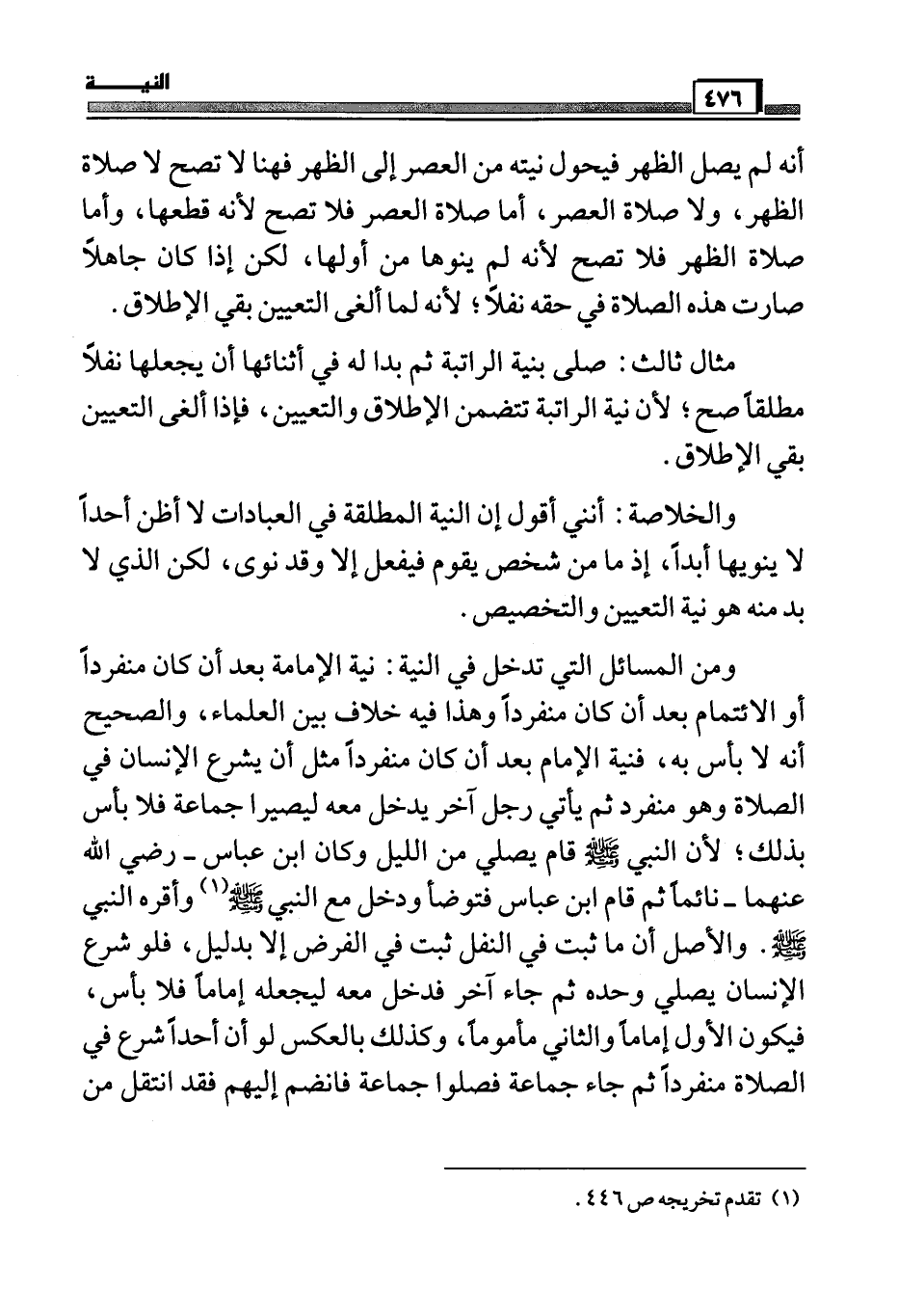 ومن المسائل التي تدخل في النية: نية الإمامة بعد أن كان منفرداً أو الائتمام بعد أن كان منفرداً وهذا فيه خلاف بين العلماء، والصحيح أنه لا بأس به، فنية الإمام بعد أن كان منفرداً مثل أن يشرع الإنسان في الصلاة وهو منفرد ثم يأتي رجل آخر يدخل معه ليصيرا جماعة فلا بأس بذلك، لأن النبي صَلَّى اللَّهُ عَلَيْهِ وَسَلَّمَ قام يصلي من الليل وكان ابن عباس – رضى الله عنهما – نائماً ثم قام ابن عباس فتوضأ ودخل مع النبي صَلَّى اللَّهُ عَلَيْهِ وَسَلَّمَ (¬1) وأقره النبي صَلَّى اللَّهُ عَلَيْهِ وَسَلَّمَ. والأصل أن ما ثبت في النفل ثبت في الفرض إلا بدليل، لو شرع الإنسان يصلي وحده ثم جاء آخر فدخل معه ليجعله إماماً له فلا بأس، فيكون الأول إماماً والثاني مأموماً، وكذلك بالعكس لو أن أحداً شرع في الصلاة منفرداً ثم جاء جماعة فصلوا جماعة فانضم إليهم فقد انتقل من