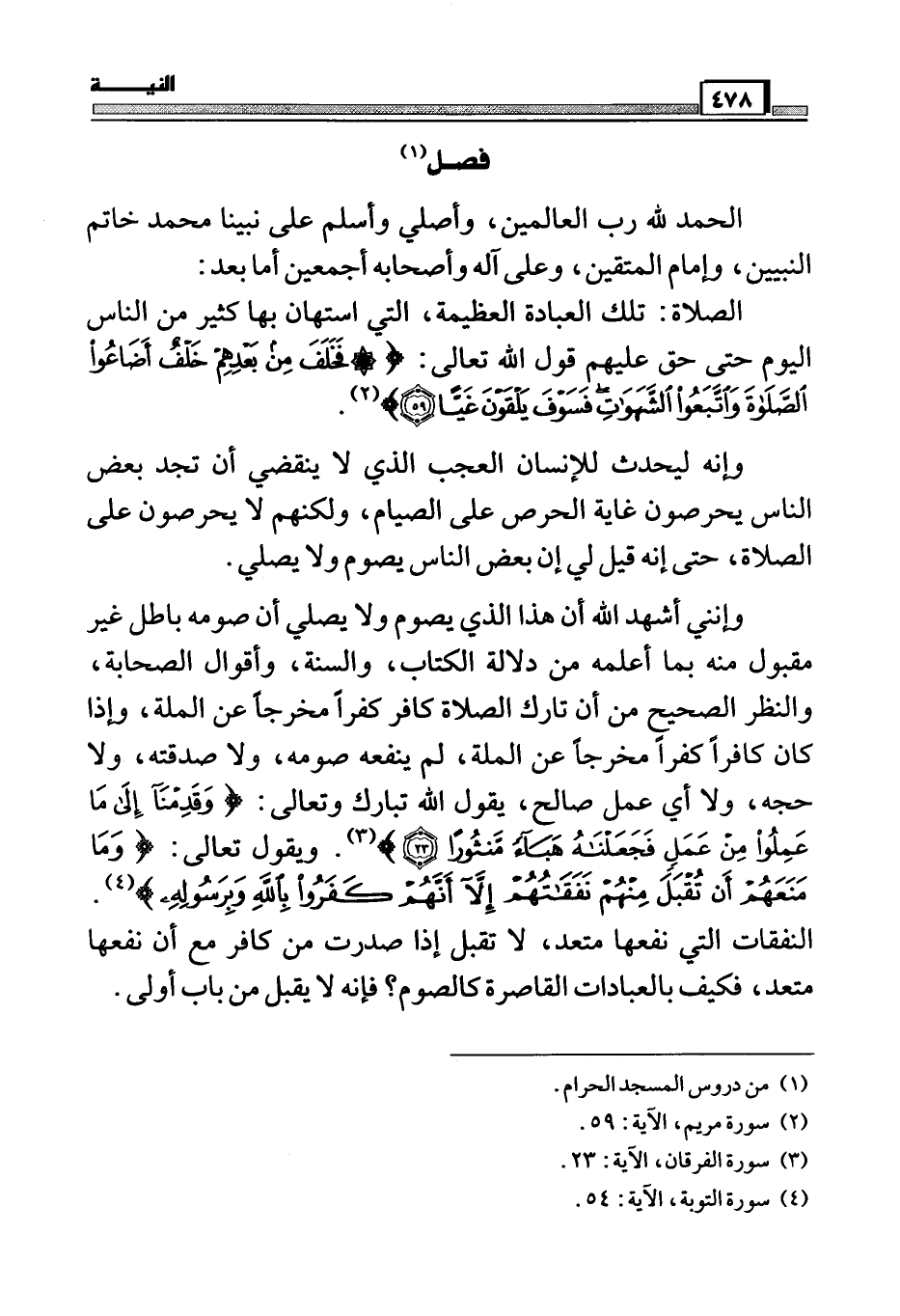 وإنني أشهد الله أن هذا الذي يصوم ولا يصلي أن صومه باطل غير مقبول منه بما أعلمه من دلالة الكتاب، والسنة، وأقوال الصحابة، والنظر الصحيح من أن تارك الصلاة كافراً مخرجاً من الملة، وإذا كان كافراً كفراً مخرجاً من الملة، لم ينفعه صومه، ولا صدقته، ولا حجه، ولا أي عمل صالح، يقول الله تبارك وتعالى (وَقَدِمْنَا إِلَى مَا عَمِلُوا مِنْ عَمَلٍ فَجَعَلْنَاهُ هَبَاءً مَنْثُوراً 23) (¬3) . ويقول تعالى (وَمَا مَنَعَهُمْ أَنْ تُقْبَلَ مِنْهُمْ نَفَقَاتُهُمْ إِلَّا أَنَّهُمْ كَفَرُوا بِاللَّهِ وَبِرَسُولِهِ) (¬4) . النفقات التي نفعها متعد، لا تقبل إذا صدرت من كافر مع أن نفعها متعد،فكيف بالعبادات القاصرة كالصوم؟ فإنه لا يقبل من باب أولى.