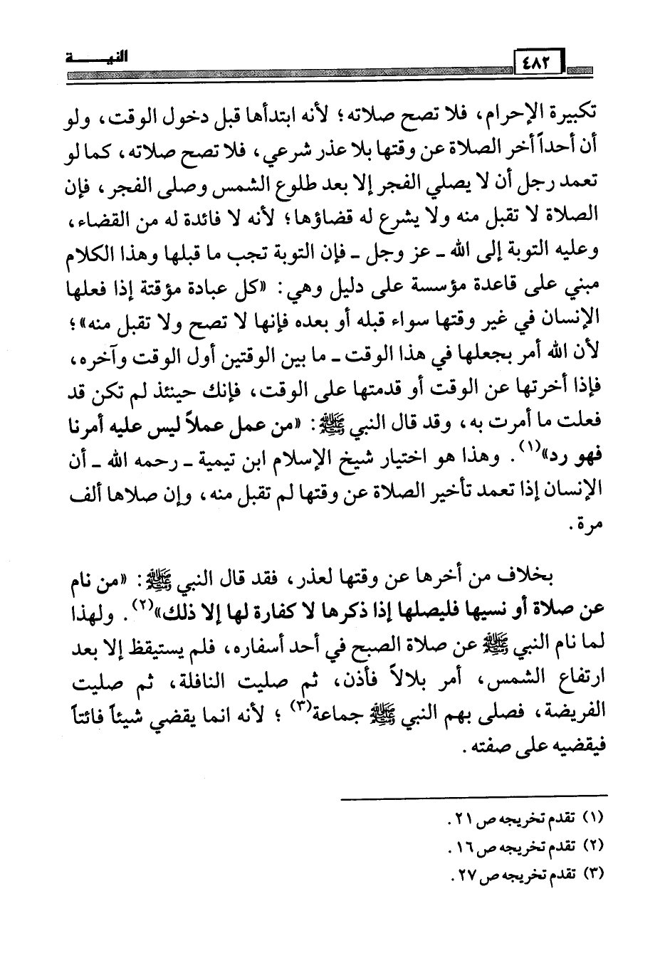 تكبيرة الإحرام، فلا تصح صلاته، لأنه ابتدأها قبل دخول الوقت، ولو أن أحداً أخر الصلاة عن وقتها بلا عذر شرعي، فلا تصح صلاته، كما لو تعمد رجل أن لا يصلي الفجر إلا بعد طلوع الشمس وصلى الفجر، فإن الصلاة لا تقبل منه ولا يشرع له قضاؤها، لأنه لا فائدة له من القضاء، وعليه التوبة إلى الله، عز وجل – فإن التوبة تجب ما قبلها وهذا الكلام مبني على قاعدة مؤسسة على دليل وهي: ((كل عبادة مؤقتة إذا فعلها الإنسان في غير وقتها سواء قبله أو بعده فإنها لا تصح ولا تقبل منه)) ، لأن الله أمر بجعلها في هذا الوقت – ما بين الوقتين أول الوقت وآخره، فإذا أخرتها عن الوقت أو قدمتها على الوقت، فإنك حينئذ لم تكن قد فعلت ما أمرت به، وقد قال النبي صَلَّى اللَّهُ عَلَيْهِ وَسَلَّمَ: (من عمل عملاً ليس عليه أمرنا فهو رد)) (¬1) . وهذا هو اختيار شيخ الإسلام ابن تيمية – رحمه الله – أن الإنسان إذا تعمد تأخير الصلاة عن وقتها لم تقبل منه، وإن صلاها ألف مرة.