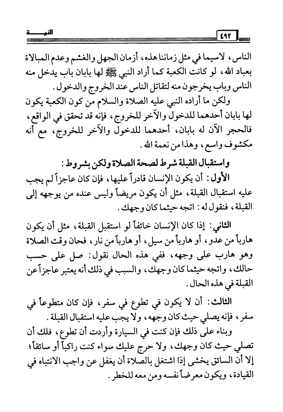 الناس، لاسيما في مثل زماننا هذه، أزمان الجهل والغشم وعدم المبالاة بعاد الله، ولو كانت الكعبة كما أراد النبي صَلَّى اللَّهُ عَلَيْهِ وَسَلَّمَ لها بابان يدخل منه الناس وباب يخرجون منه لتقاتل الناس عند الخروج والدخول.