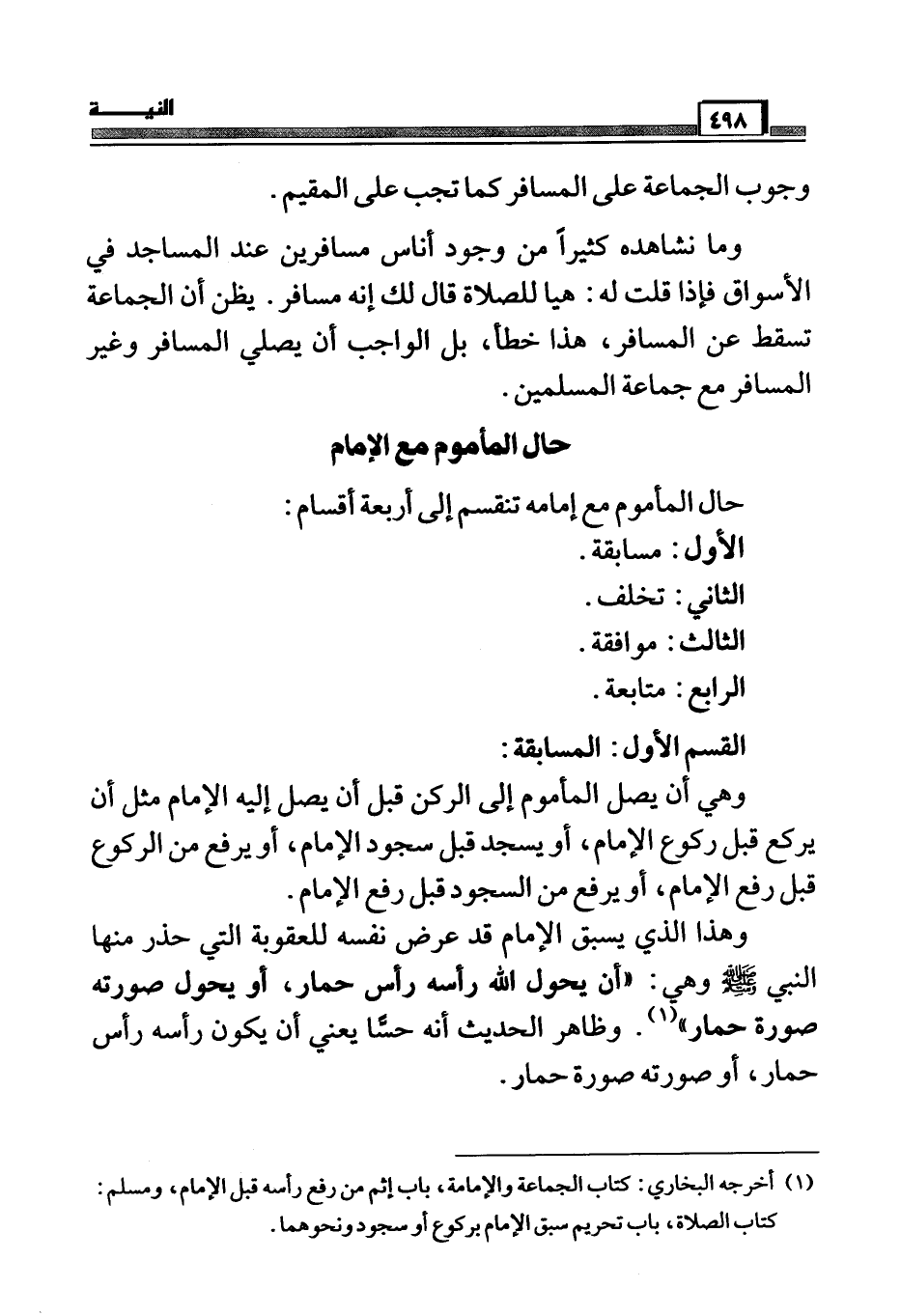 (¬1) أخرجه البخاري: كتاب الجماعة والإمامة، باب إثم من رفع رأسه قبل الإمام، ومسلم: كتاب الصلاة، باب تحريم سبق الإمام بركوع أو سجود ونحوهما.