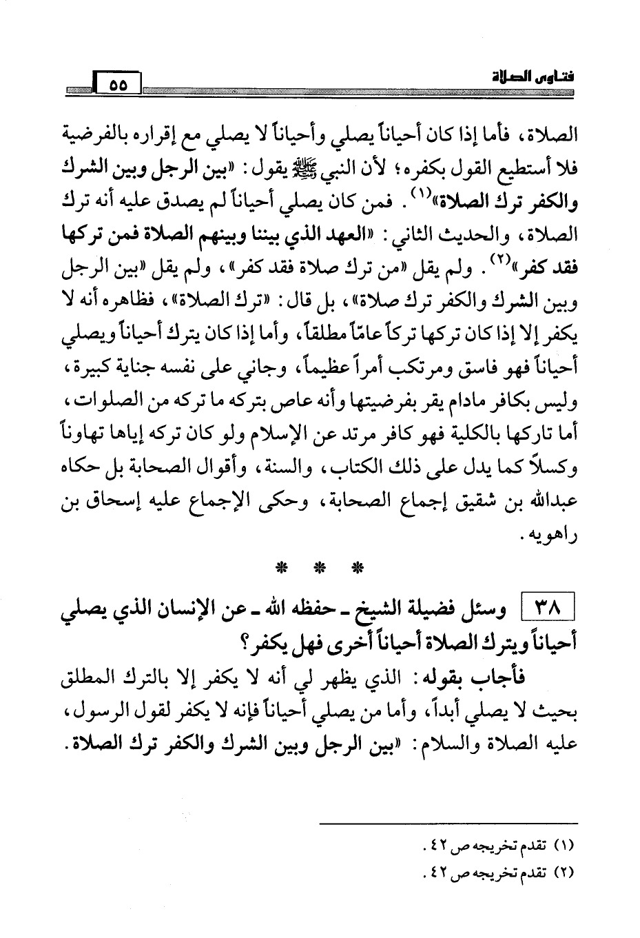 38) وسئل فضيلة الشيخ - حفظه الله - عن الإنسان الذي يصلي أحياناً ويترك الصلاة أحياناً ويترك الصلاة أحياناً أخرى فهل يكفر؟