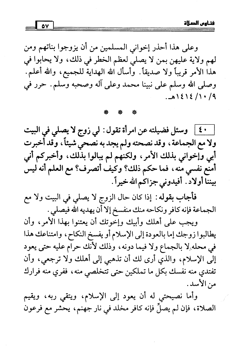 فأجاب بقوله: إذا كان حال الزوج لا يصلي في البيت ولا مع الجماعة فإنه كافر ونكاحه منك منفسخ إلا أن يهديه الله فيصلي.