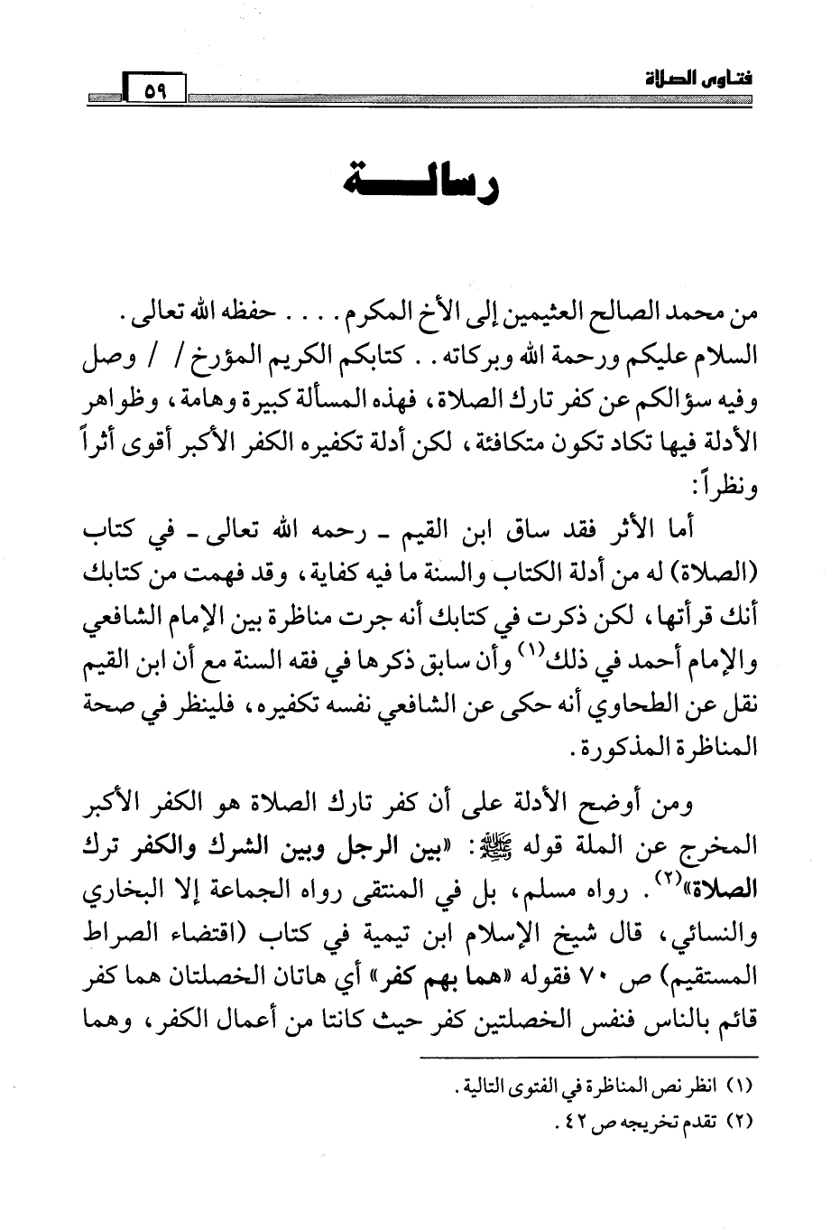 ومن أوضح الأدلة على أن كفر تارك الصلاة هو الكفر الأكبر المخرج عن الملة قوله صَلَّى اللَّهُ عَلَيْهِ وَسَلَّمَ: " بين الرجل وبين الشرك والكفر ترك الصلاة " (¬2) . رواه مسلم، بل في المنتقى رواه الجماعة إلا البخاري والنسائي، قال شيخ الإسلام ابن تيمية في كتاب (اقتضاء الصراط المستقيم) ص70 فقوله " هما بهما كفر " أي هاتان الخصلتان هما كفر قائم بالناس فنفس الخصلتين كفر حيث كانتا من أعمال الكفر، وهما