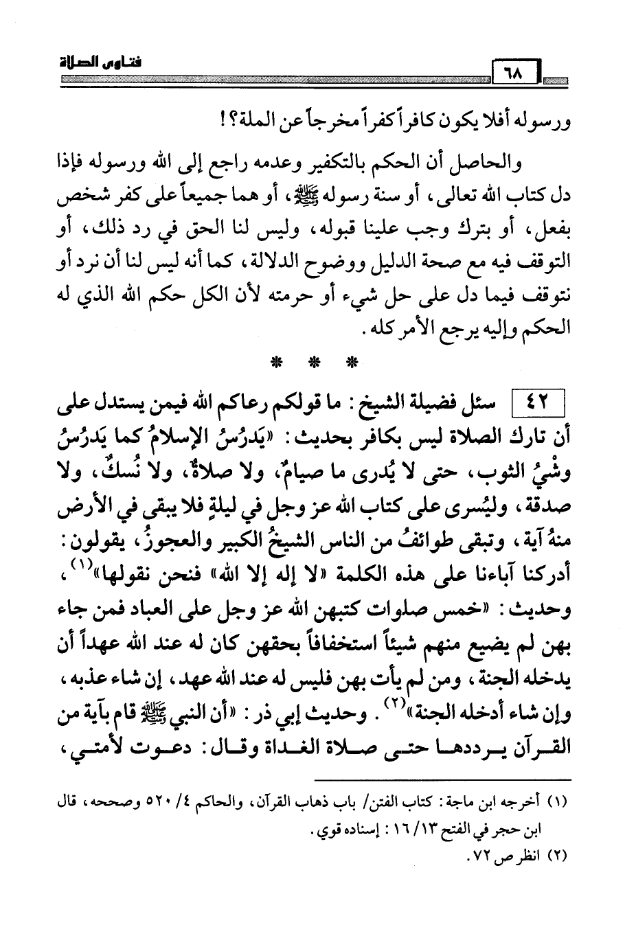 42) سئل فضيلة الشيخ: ما قولكم رعاكم الله فيمن يستدل على أن تارك الصلاة ليس بكافر بحديث: " يدرس الإسلام كما يدرس وشي الثوب، حتى لا يدرى ما صيام، ولا صلاة، ولا نسك، ولا صدقة، وليسرى على كتاب الله عز وجل في ليلة فلا يبقى في الأرض منه آية، وتبقى طوائف من الناس الشيخ الكبير والعجوز، يقولون: أدركنا آباءنا على هذه الكلمة " لا إله إلا الله " فنحن نقولها " (¬1) ، وحديث: " خمس صلوات كتبهن الله عز وجل على العباد فمن جاء بهن لم يضيع منهم شيئاً استخفافاً بحقهن كان له عند الله عهداً أن يدخله الجنة، ومن لم يأت بهن فليس له عند الله عهد، إن شاء عذبه، وإن شاء أدخله الجنة " (¬2) . وحديث أبي ذر: " أن النبي صَلَّى اللَّهُ عَلَيْهِ وَسَلَّمَ قام بآية من القرآن يرددها حتى صلاة الغداة وقال: دعوت لأمتي،