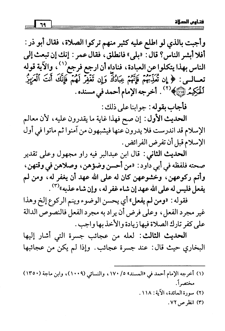 الحديث الثاني: قال ابن عبد البر فيه راو مجهول وعلى تقدير صحته فلفظه في أبي داود: " من أحسن وضؤهن، وصلاتهن في وقتهن، وأتم ركوعهن، وخشوعهن كان له على الله عهد أن يغفر له، وإن شاء عذبه " (¬3) .