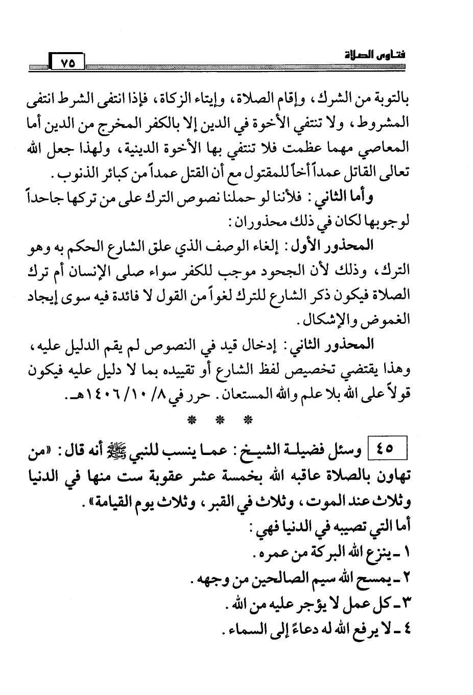 45) وسئل فضيلة الشيخ: عما ينسب للنبي صَلَّى اللَّهُ عَلَيْهِ وَسَلَّمَ أنه قال: " من تهاون بالصلاة عاقبه الله بخمسة عشر عقوبة ست منها في الدنيا وثلاث عند الموت، وثلاث في القبر، وثلاث يوم القيامة ".