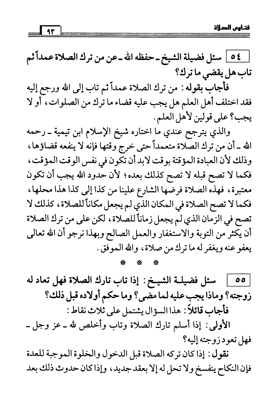 55) سئل فضيلة الشيخ: إذا تاب تارك الصلاة فهل تعاد له زوجته؟ وماذا يجب عليه لما مضى؟ وما حكم أولاده قبل ذلك؟