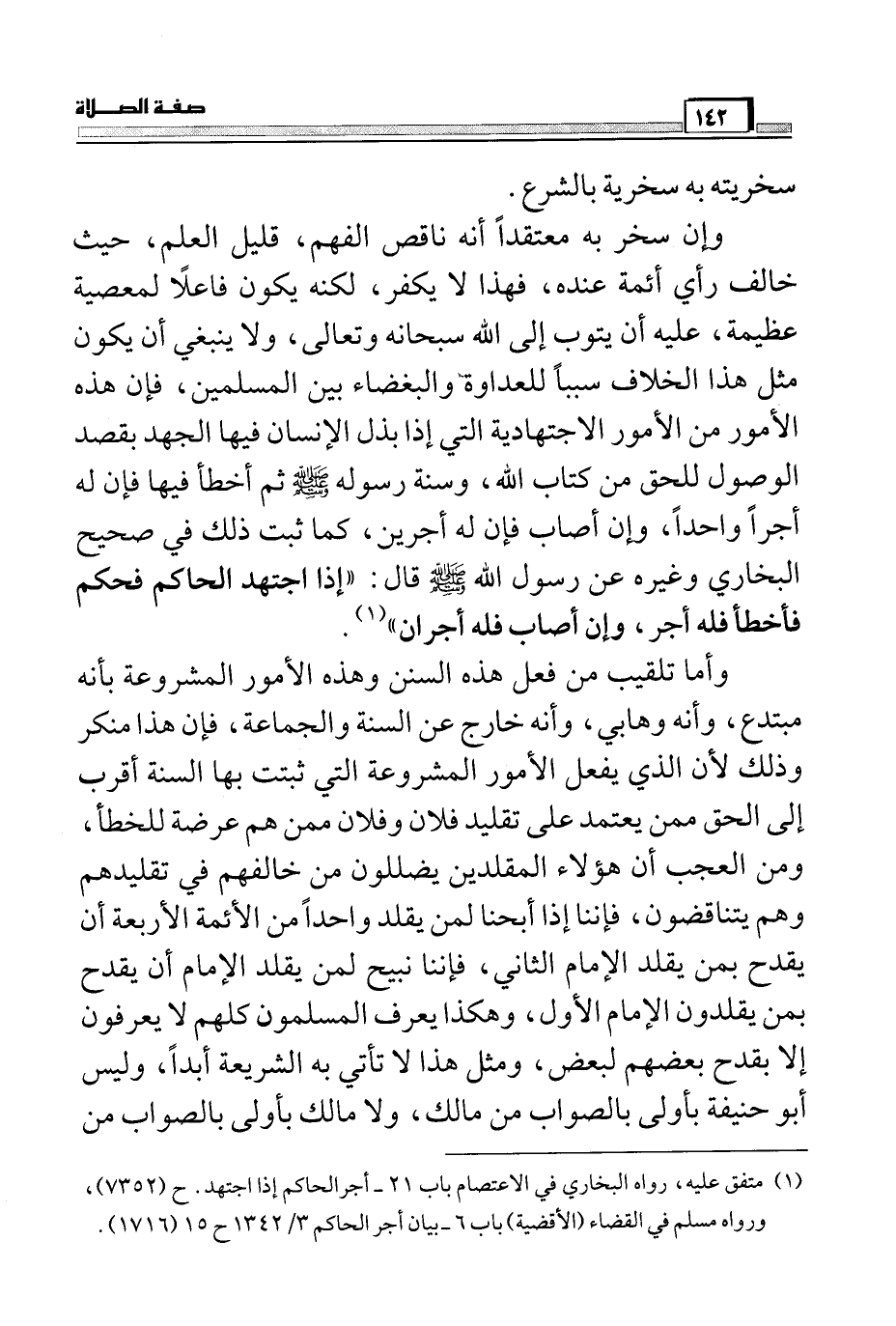 وإن سخر به معتقداً أنه ناقص الفهم، قليل العلم، حيث خالف رأي أئمة عنده، فهذا لا يكفر، لكنه يكون فاعلاً لمعصية عظيمة، عليه أن يتوب إلى الله سبحانه وتعالى، ولا ينبغي أن يكون مثل هذا الخلاف سبباً للعداوة والبغضاء بين المسلمين، فإن هذه الأمور من الأمور الاجتهادية التي إذا بذل الإنسان فيها الجهد بقصد الوصول للحق من كتاب الله، وسنة رسوله صَلَّى اللَّهُ عَلَيْهِ وَسَلَّمَ ثم أخطأ فيها فإن له أجراً واحداً، وإن أصاب فإن له أجرين، كما ثبت ذلك في صحيح البخاري وغيره عن رسول الله صَلَّى اللَّهُ عَلَيْهِ وَسَلَّمَ قال: "إذا اجتهد الحاكم فحكم فأخطأ فله أجر، وإن أصاب فله أجران" (¬1) .