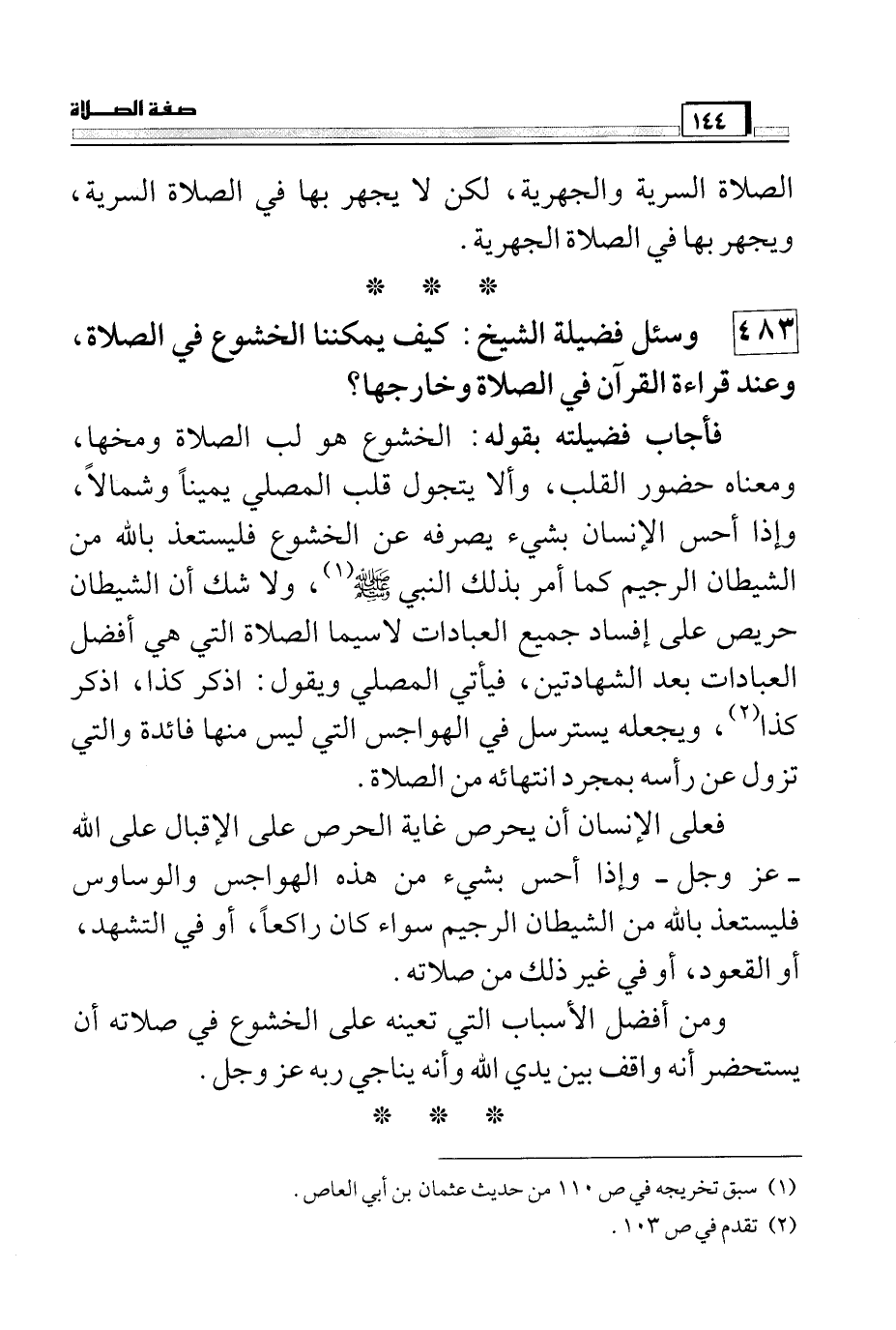 فأجاب فضيلته بقوله: الخشوع هو لب الصلاة ومخها، ومعناه حضور القلب، وألا يتجول قلب المصلي يميناً وشمالاً، وإذا أحس الإنسان بشيء يصرفه عن الخشوع فليستعذ بالله من الشيطان الرجيم كما أمر بذلك النبي صَلَّى اللَّهُ عَلَيْهِ وَسَلَّمَ (¬1) ، ولا شك أن الشيطان حريص على إفساد جميع العبادات لاسيما الصلاة التي هي أفضل العبادات بعد الشهادتين، فيأتي المصلي ويقول: اذكر كذا، اذكر كذا (¬2) ، ويجعله يسترسل في الهواجس التي ليس منها فائدة والتي تزول عن رأسه بمجرد انتهائه من الصلاة.