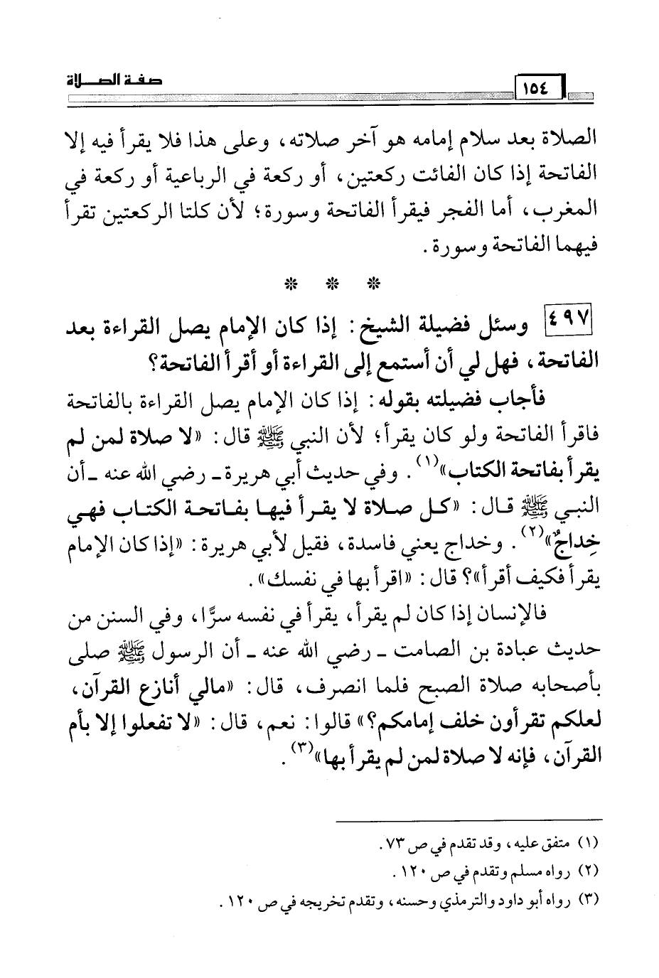 فالإنسان إذا كان لم يقرأ، يقرأ في نفسه سراً، وفي السنن من حديث عبادة بن الصامت – رضي الله عنه – أن الرسول صَلَّى اللَّهُ عَلَيْهِ وَسَلَّمَ صلى بأصحابه صلاة الصبح فلما انصرف، قال: "مالي أنازع القرآن، لعلكم تقرأون خلف إمامكم؟ " قالوا: نعم، قال: "لا تفعلوا إلا بأم القرآن، فإنه لا صلاة لمن لم يقرأ بها" (¬3) .