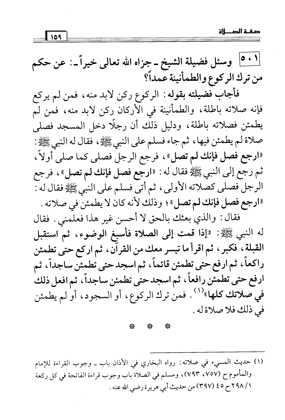 501 وسئل فضيلة الشيخ: جزاه الله تعالى خيراً -: عن حكم من ترك الركوع والطمأنينة عمداً؟