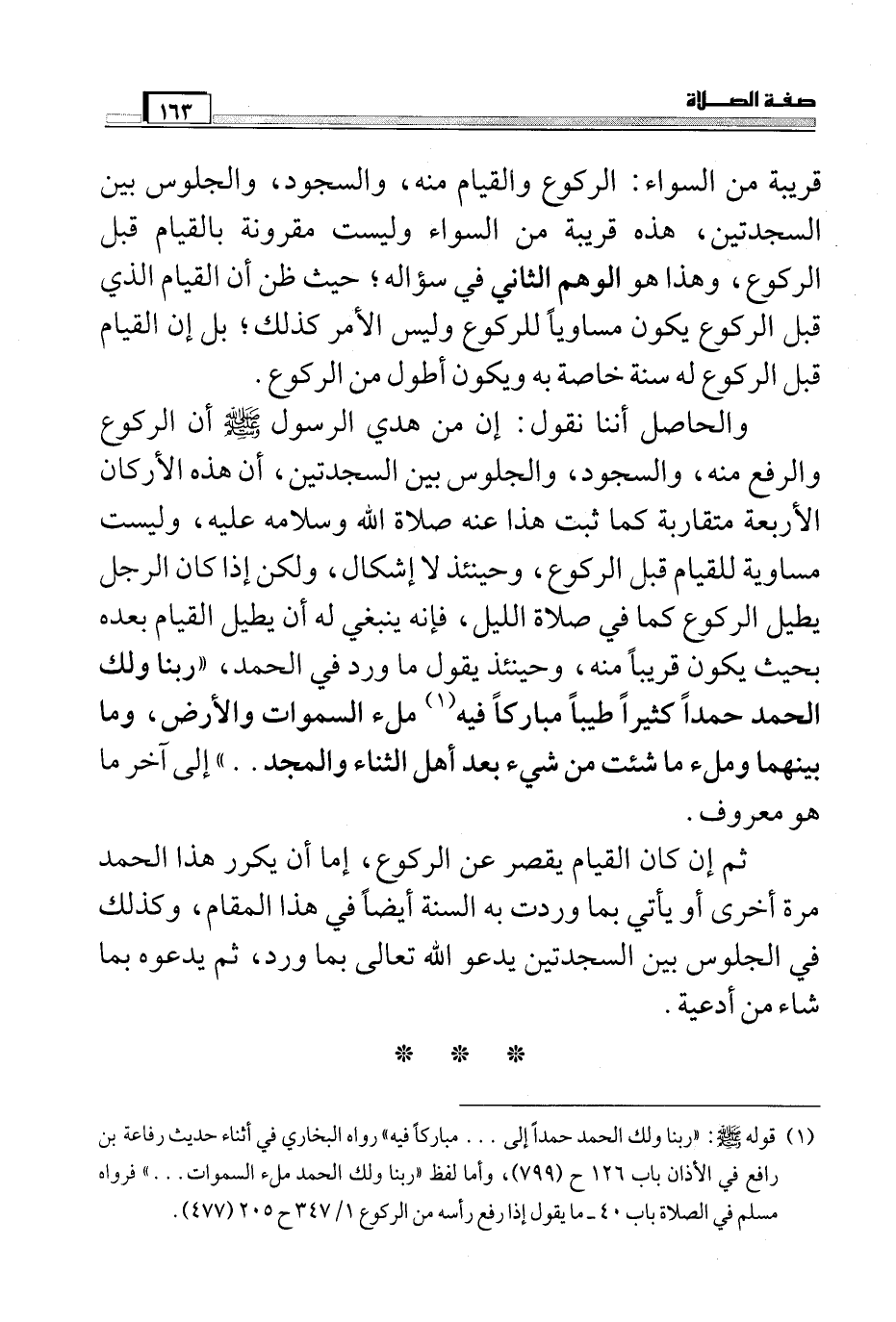 (¬1) قوله صَلَّى اللَّهُ عَلَيْهِ وَسَلَّمَ: "ربنا ولك الحمد حمداً إلى. مباركاً فيه" رواه البخاري في أثناء حديث رفاعة بن رافع في الأذان باب 126 ح (799) ، وأما لفظ "ربنا ولك الحمد ملء السموات ... " فرواه مسلم في الصلاة باب 40 – ما يقول إذا رفع رأسه من الركوع 1/347 ح205 (477) .