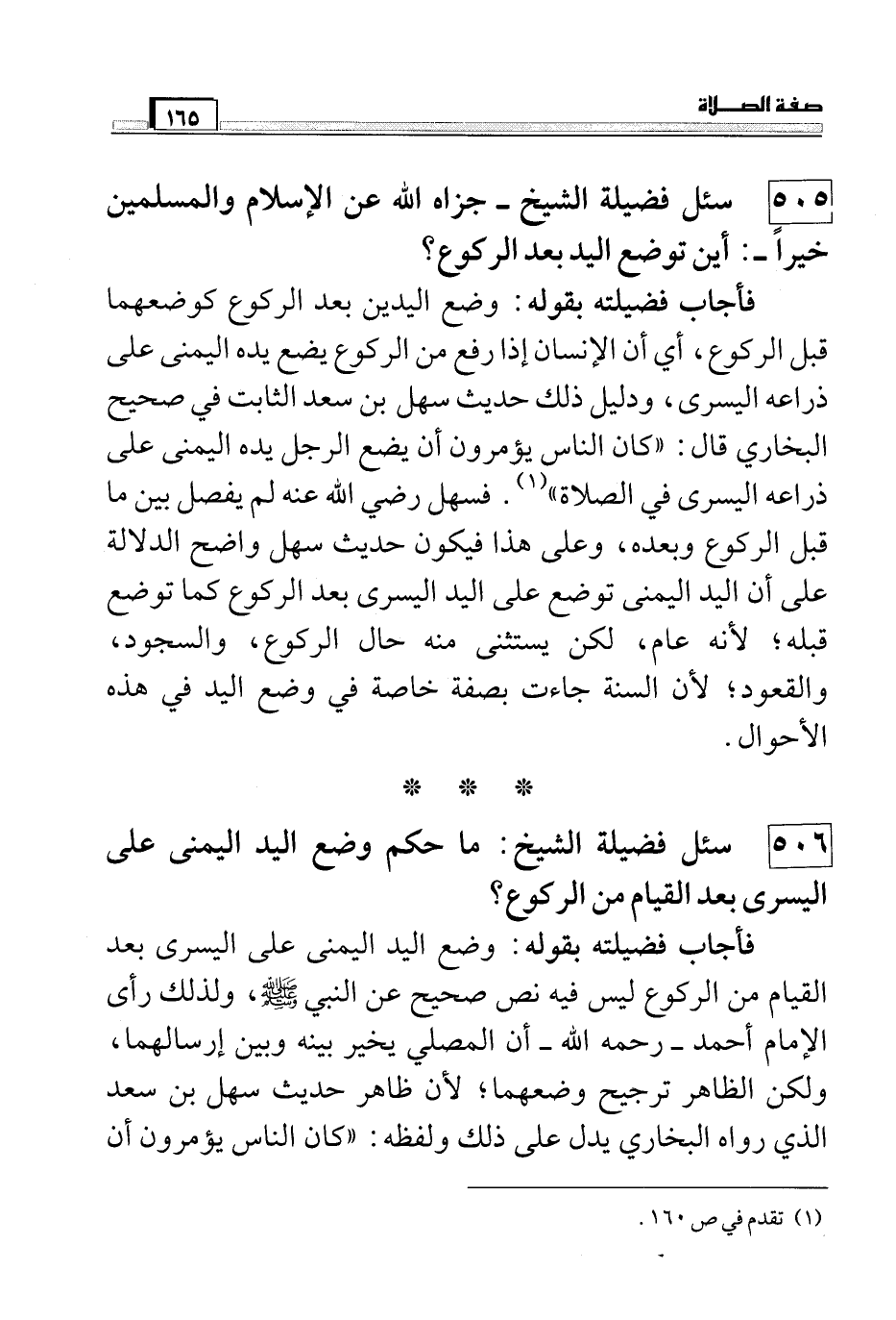فأجاب فضيلته بقوله: وضع اليدين بعد الركوع كوضعهما قبل الركوع، أي أن الإنسان إذا رفع من الركوع يضع يده اليمنى على ذراعه اليسرى، ودليل ذلك حديث سهل بن سعد الثابت في صحيح البخاري قال: "كان الناس يؤمرون أن يضع الرجل يده اليمنى على ذراعه اليسرى في الصلاة" (¬1) . فسهل رضي الله عنه لم يفصل بين ما قبل الركوع وبعده، وعلى هذا فيكون حديث سهل واضح الدلالة على أن اليد اليمنى توضع على اليد اليسرى بعد الركوع كما توضع قبله؛ لأنه عام، لكن يستثنى منه حال الركوع، والسجود، والقعود؛ لأن السنة جاءت بصفة خاصة في وضع اليد في هذه الأحوال.