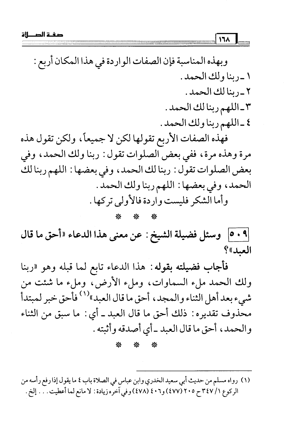 (¬1) رواه مسلم من حديث أبي سعيد الخدري وابن عباس في الصلاة باب 4 ما يقول إذا رفع رأسه من الركوع 1/347 ح205 (477) و406 (478) وفي آخره زيادة: لا مانع لما أعطيت إلخ.
