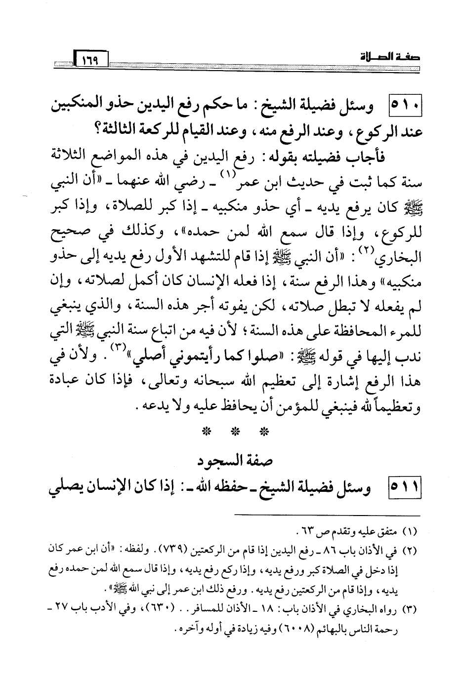 510 وسئل فضيلة الشيخ: ما حكم رفع اليدين حذو المنكبين عند الركوع، وعند الرفع منه، وعند القيام للركعة الثالثة؟