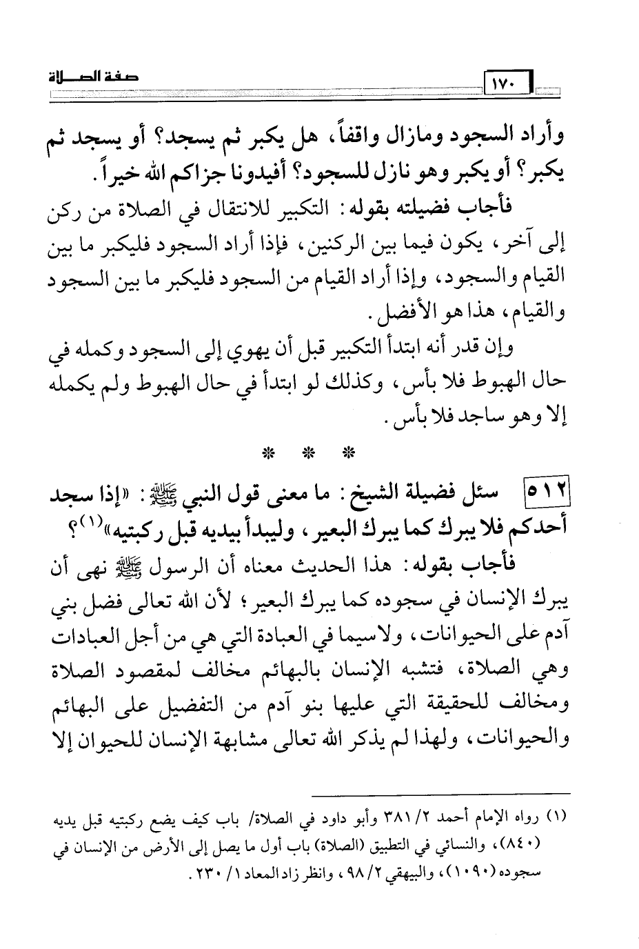 512 سئل فضيلة الشيخ: ما معنى قول النبي صَلَّى اللَّهُ عَلَيْهِ وَسَلَّمَ: "إذا سجد أحدكم فلا يبرك كما يبرك البعير، وليبدأ بيديه قبل ركبتيه" (¬1) ؟