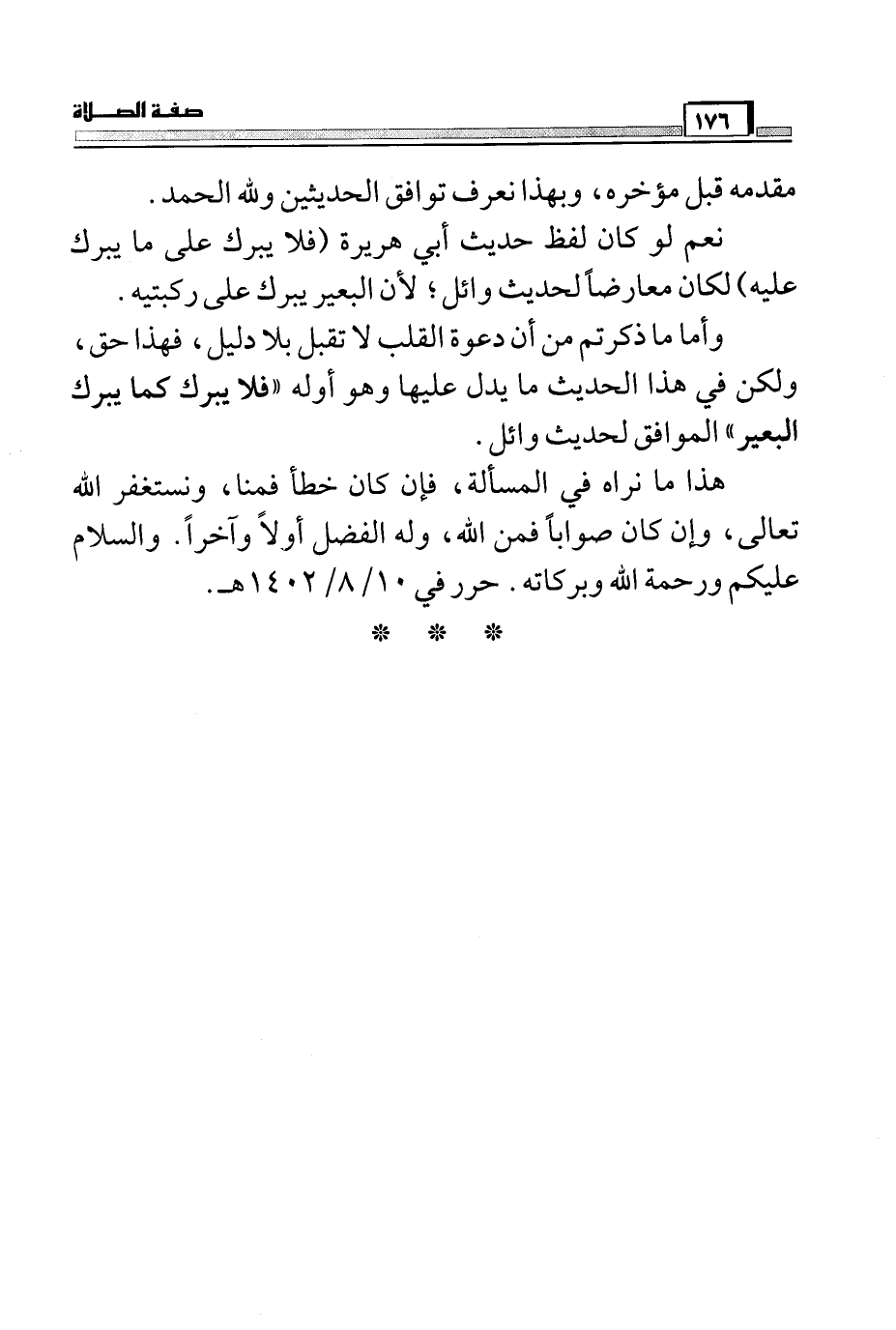 هذا ما نراه في المسألة، فإن كان خطأ فمنا، ونستغفر الله تعالى، وإن كان صواباً فمن الله، وله الفضل أولاً وأخراً. والسلام عليكم ورحمة الله وبركاته. حرر في 10/8/1402هـ.