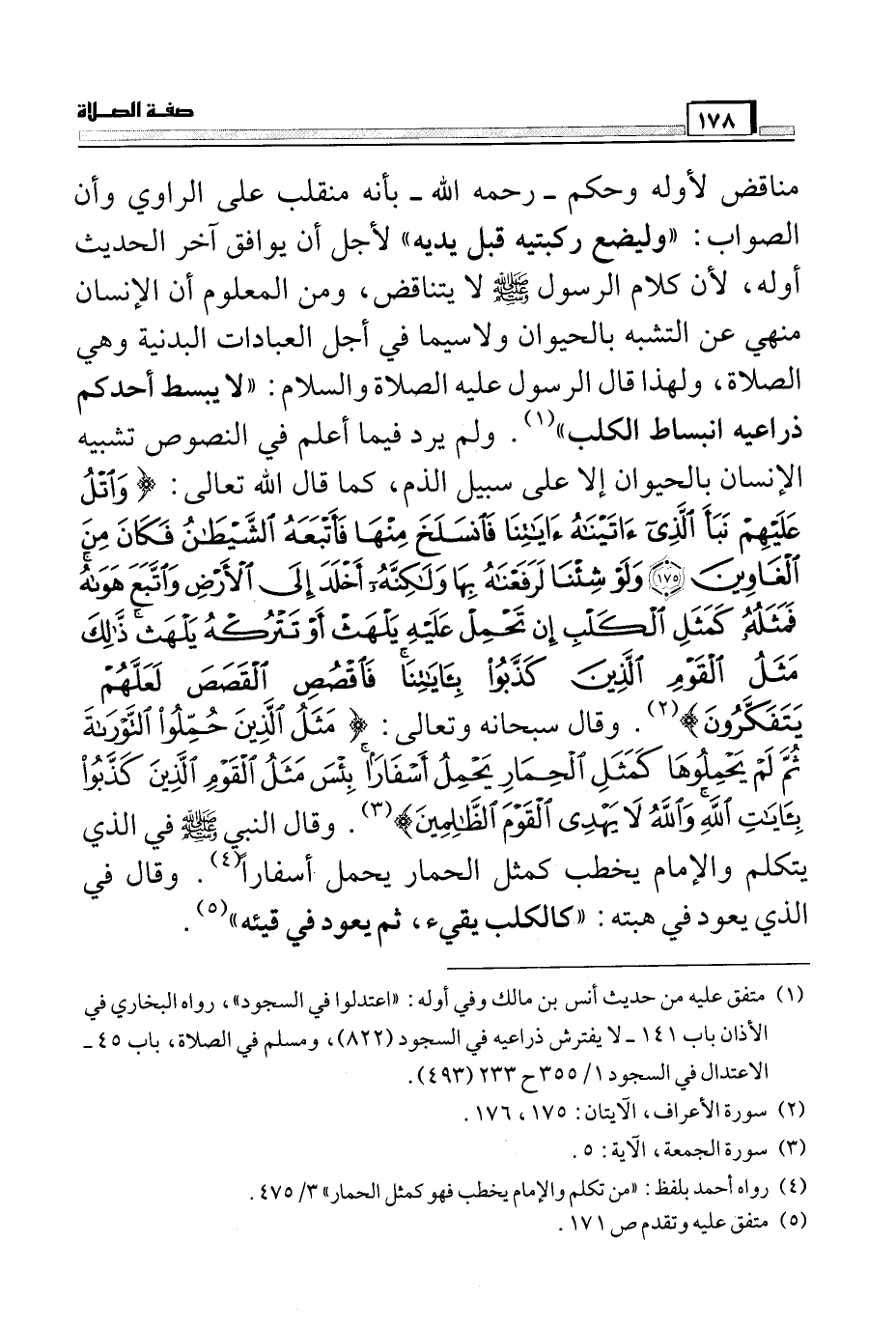 مناقض لأوله وحكم – رحمه الله – بأنه منقلب على الراوي وأن الصواب: "وليضع ركبتيه قبل يديه" لأجل أن يوافق آخر الحديث أوله، لأن كلام الرسول صَلَّى اللَّهُ عَلَيْهِ وَسَلَّمَ لا يتناقض، ومن المعلوم أن الإنسان منهي عن التشبه بالحيوان ولاسيما في أجل العبادات البدنية وهي الصلاة، ولهذا قال الرسول عليه الصلاة والسلام: "لا يبسط أحدكم ذراعية انبساط الكلب" (¬1) .
