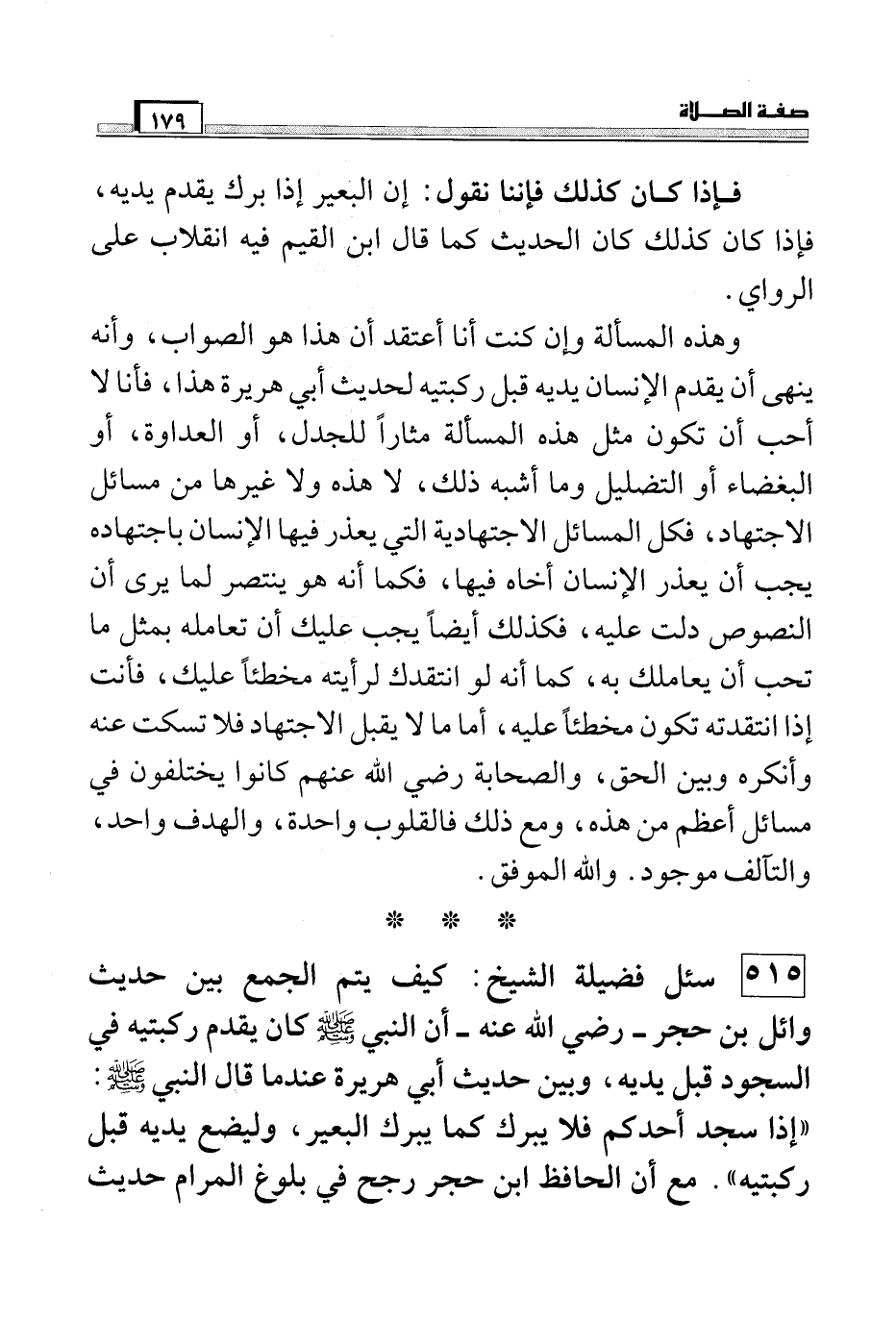 515 سئل فضيلة الشيح: كيف يتم الجمع بين حديث وائل بن حجر – رضي الله عنه – أن النبي صَلَّى اللَّهُ عَلَيْهِ وَسَلَّمَ كان يقدم ركبتيه في السجود قبل يديه، وبين حديث أبي هريرة عندما قال النبي صَلَّى اللَّهُ عَلَيْهِ وَسَلَّمَ: "إذا سجد أحدكم فلا يبرك كما يبرك البعير، وليضع يديه قبل ركبتيه". مع أن الحافظ ابن حجر رجح في بلوغ المرام حديث