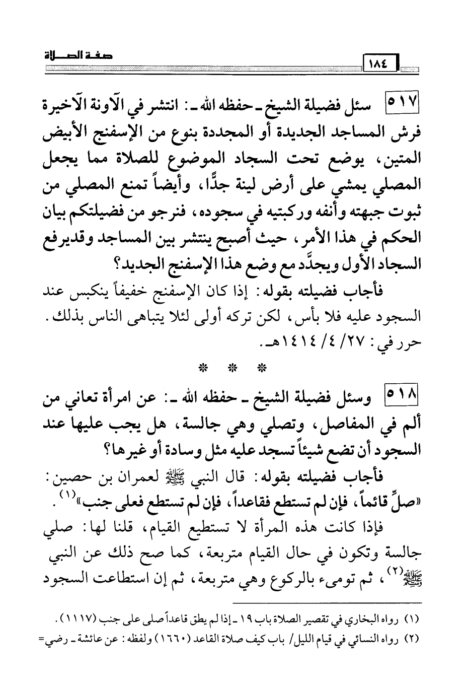 517 سئل فضيلة الشيخ – حفظه الله -: انتشر في الآونة الأخيرة فرش المساجد الجديدة أو المجددة بنوع من الإسفنج الأبيض المتين، يوضع تحت السجاد الموضوع للصلاة مما يجعل المصلي يمشي على أرض لينة جداً، وأيضاً تمنع المصلي من ثبوت جبهته وأنفه وركبتيه في سجوده، فنرجو من فضيلتكم بيان الحكم في هذا الأمر، حيث أصبح ينتشر بين المساجد وقد يرفع السجاد الأول ويجدد مع وضع هذا الإسفنج الجديد؟