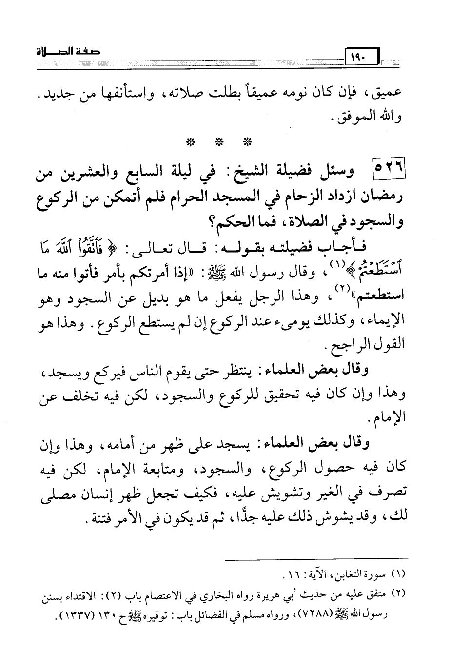 526 وسئل فضيلة الشيخ: في ليلة السابع والعشرين من رمضان ازداد الزحام في المسجد الحرام فلم أتمكن من الركوع والسجود في الصلاة، فما الحكم؟