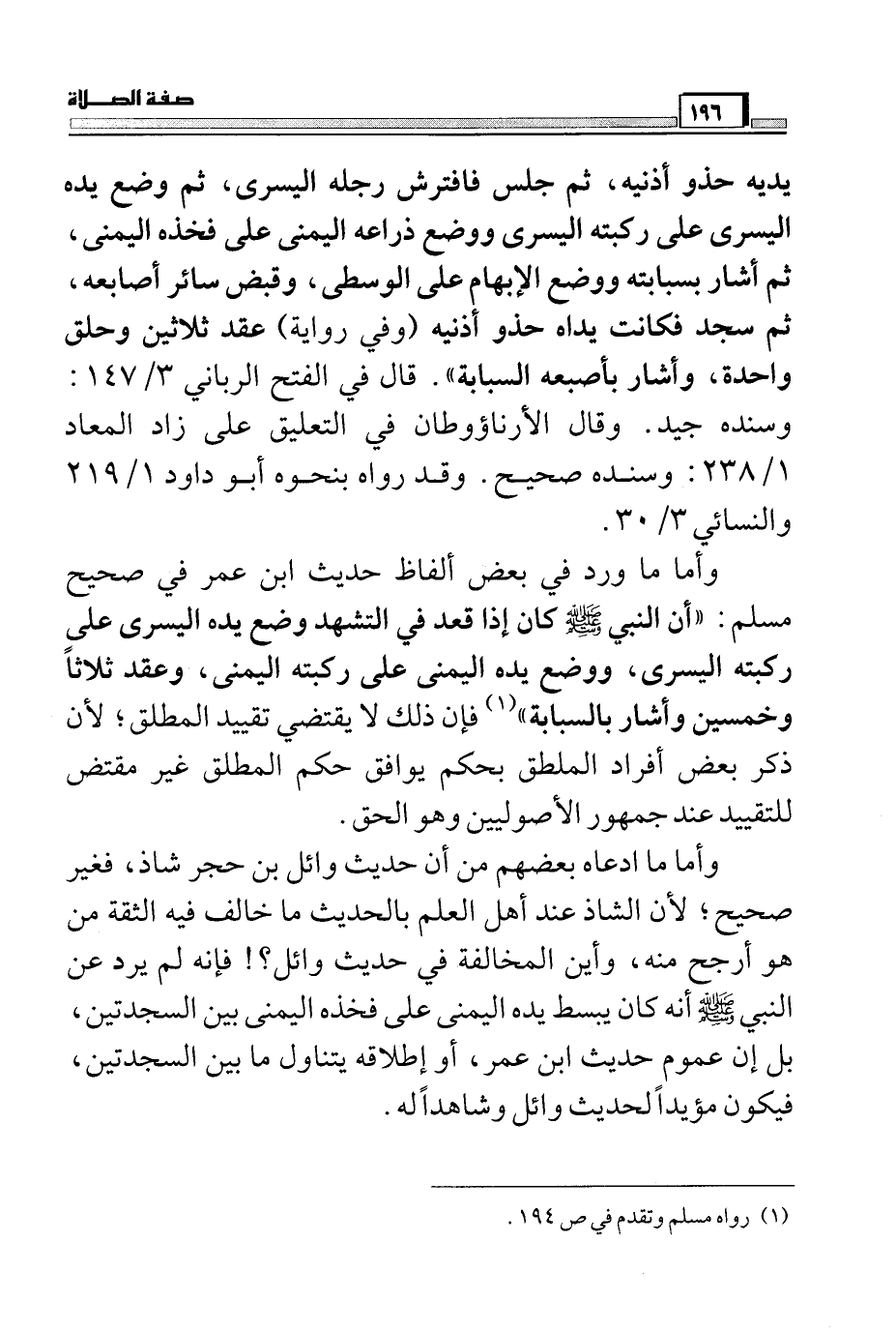 يديه حذو أذنيه، ثم جلس فافترش رجله اليسرى، ثم وضع يده اليسرى على ركبته اليسرى ووضع ذراعه اليمنى على فخذه اليمنى، ثم أشار بسبابته ووضع الإبهام على الوسطى، وقبض سائر أصابعه، ثم سجد فكانت يداه حذو أذنيه (وفي رواية) عقد ثلاثين وحلق واحدة، وأشار بإصبعه السبابة". قال في الفتح الرباني 3/147: وسنده جيد. وقال الأرناؤوطان في التعليق على زاد المعاد 1/238: وسنده صحيح. وقد رواه بنحوه أبو داود 1/219 والنسائي 3/30.