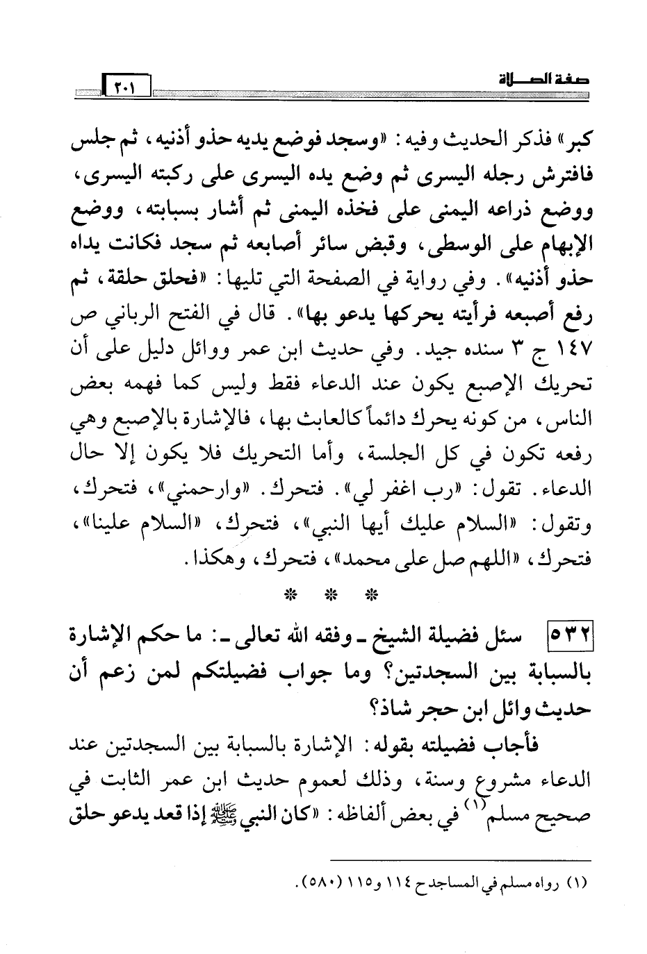 532 سئل فضيلة الشيخ – وفقه الله تعالى-: ما حكم الإشارة بالسبابة بين السجدتين؟ وما جواب فضيلتكم لمن زعم أن حديث وائل ابن حجر شاذ؟