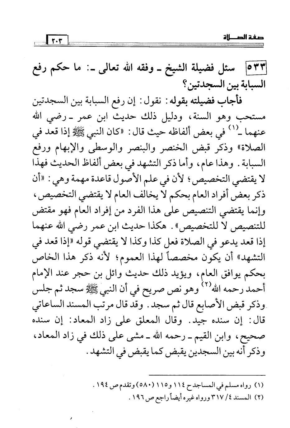 فأجاب فضيلته بقوله: نقول: إن رفع السبابة بين السجدتين مستحب وهو السنة، ودليل ذلك حديث ابن عمر – رضي الله عنهما (¬1) – في بعض ألفاظه حيث قال: "كان النبي صَلَّى اللَّهُ عَلَيْهِ وَسَلَّمَ إذا قعد في الصلاة" وذكر قبض الخنصر والبنصر والوسطى والإبهام، ورفع السبابة. وهذا عام، وأما ذكر التشهد في بعض ألفاظ الحديث فهذا لا يقتضي التخصيص؛ لأن في علم الأصول قاعدة مهمة وهي: "أن ذكر بعض أفراد العام بحكم لا يخالف العام لا يقتضي التخصيص، وإنما يقتضي التنصيص على هذا الفرد من إفراد العام فهو مقتض للتنصيص لا للتخصيص". هكذا حديث ابن عمر رضي الله عنهما إذا قعد يدعو في الصلاة فعل كذا وكذا لا يقتضي قوله "إذا قعد في التشهد" أن يكون مخصصاً لهذا العموم؛ لأنه ذكر هذا الخاص بحكم يوافق العام، ويؤيد ذلك حديث وائل بن حجر عند الإمام أحمد رحمه الله (¬2) وهو نص صريح في أن النبي صَلَّى اللَّهُ عَلَيْهِ وَسَلَّمَ سد ثم جلس وذكر قبض الأصابع قال ثم سجد. وقد قال مرتب المسند الساعاتي قال: إن سنده جيد. وقال المعلق على زاد المعاد: إن سنده صحيح، وابن القيم – رحمه الله – مشى على ذلك في زاد المعاد، وذكر أنه بين السجدتين يقبض كما يقبض في التشهد.