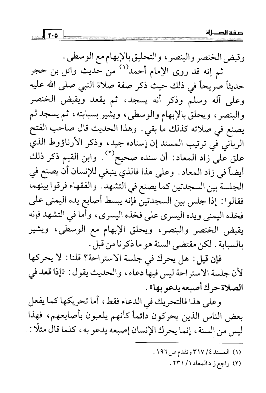 ثم إنه قد روى الإمام أحمد (¬1) من حديث وائل بن حجر حديثاً صريحاً في ذلك حيث ذكر صفة صلاة النبي صلى الله عليه وعلى آله وسلم وذكر أنه يسجد، ثم يقعد ويقبض الخنصر والبنصر، ويحلق بالإبهام والوسطى، ويشير بسبابته، ثم يسجد ثم يصنع في صلاته كذلك ما بقي. وهذا الحديث قال صاحب الفتح الرباني في ترتيب المسند إن إسناده جيد، وذكر الأرناؤوط الذي علق على زاد المعاد: أن سنده صحيح (¬2) . وابن القيم ذكر ذلك أيضاً في زاد المعاد. وعلى هذا فالذي ينبغي للإنسان أن يصنع في الجلسة بين السجدتين كما يصنع في التشهد. والفقهاء فرقوا بينهما فقالوا: إذا جلس بين السجدتين فإنه يبسط أصابع يده اليمنى على فخذه اليمنى ويده اليسرى على فخذه اليسرى، وأما في التشهد فإنه يقبض الخنصر والبنصر، ويحلق الإبهام مع الوسطى، ويشير بالسبابة. لكن مقتضى السنة هو ما ذكرنا من قبل. ...