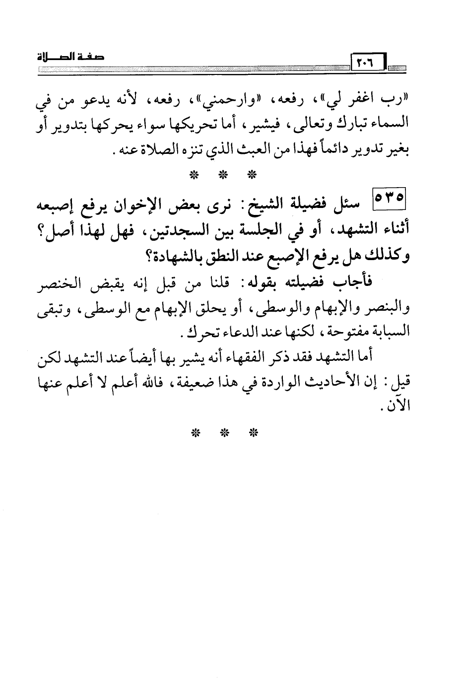 535 سئل فضيلة الشيخ: نرى بعض الإخوان يرفع إصبعه أثناء التشهد، أو في الجلسة بين السجدتين، فهل لهذا أصل؟ وكذلك هل يرفع الإصبع عند النطق بالشهادة؟