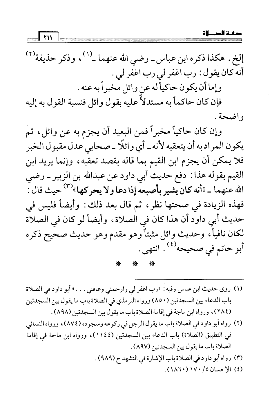 وإن كان حاكياً مخبراً فمن البعيد أن يجزم به عن وائل، ثم يكون المراد به أن يتعقبه لأنه – أي وائلاً – صحابي عدل مقبول الخبر فلا يمكن أن يجزم ابن القيم بما قاله بقصد تعقبه، وإنما يريد ابن القيم بقوله هذا: دفع حديث أبي داود عن عبد الله بن الزبير – رضي الله عنهما – "أنه كان يشير بإصبعه إذا دعا ولا يحركها" (¬3) حيث قال: فهذه الزيادة في صحتها نظر، ثم قال بعد ذلك: وأيضاً فليس في حديث أبي داود أن هذا كان في الصلاة، وأيضاً لو كان في الصلاة لكان نافياً، وحديث وائل مثبتاً وهو مقدم وهو حديث صحيح ذكره أبو حاتم في صحيحه (¬4) . انتهى.