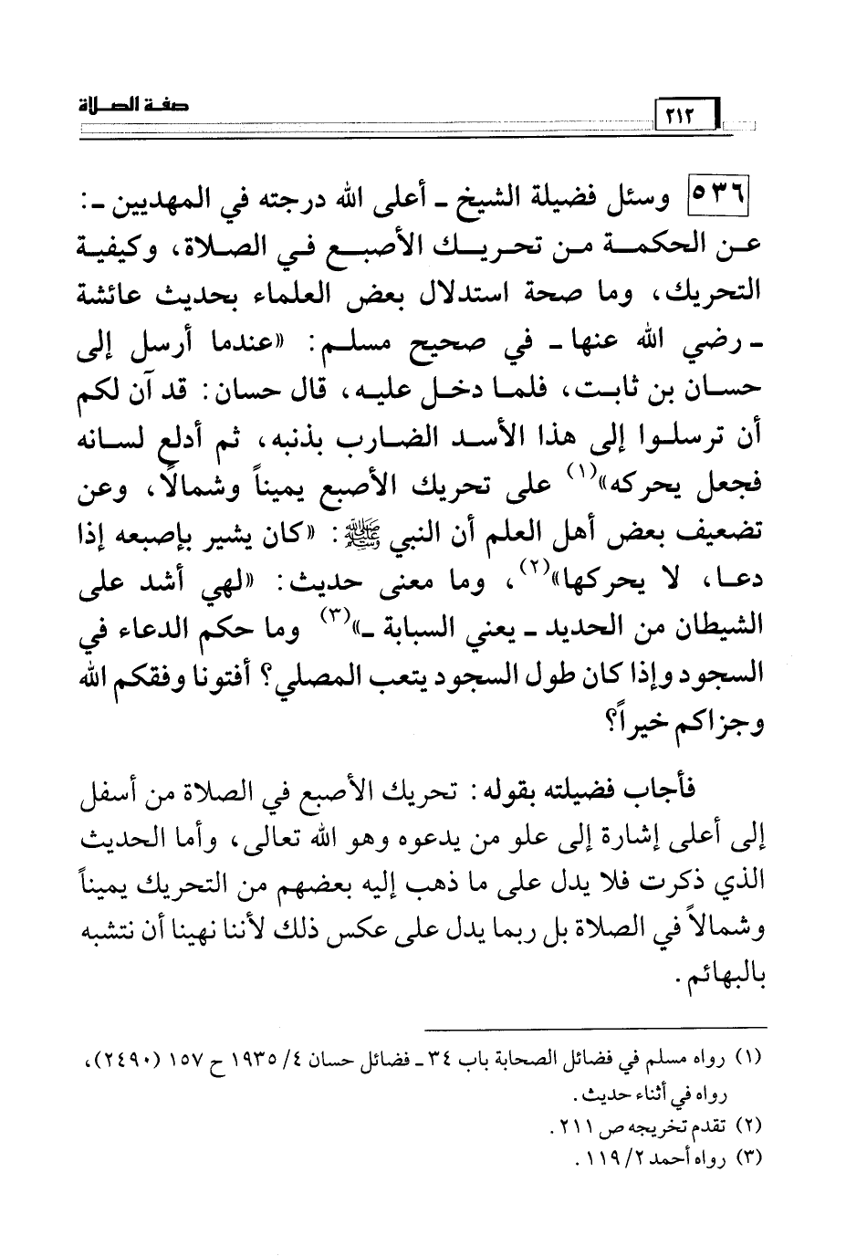 536 وسئل فضيلة الشيخ – أعلى الله درجته في المهديين-: عن الحكمة من تحريك الإصبع في الصلاة، وكيفية التحريك، وما صحة استدلال بعض العلماء بحديث عائشة – رضي الله عنها – في صحيح مسلم: "عندما أرسل إلى حسان بن ثابت، فلما دخل عليه، قال حسان: قد آن لكم أن ترسلوا إلى هذا الأسد الضارب بذنبه، ثم أدلع لسانه فجعل يحركه" (¬1) على تحريك الإصبع يميناً وشمالاً، وعن تضعيف بعض أهل العلم أن النبي صَلَّى اللَّهُ عَلَيْهِ وَسَلَّمَ: "كان يشير بإصبعه إذا دعا، لا يحركها" (¬2) ، وما معنى حديث: "لهي أشد على الشيطان من الحديد – يعني السبابة-" (¬3) وما حكم الدعاء في السجود وإذا كان طول السجود يتعب المصلي؟ أفتونا وفقكم الله وجزاكم خيراً؟